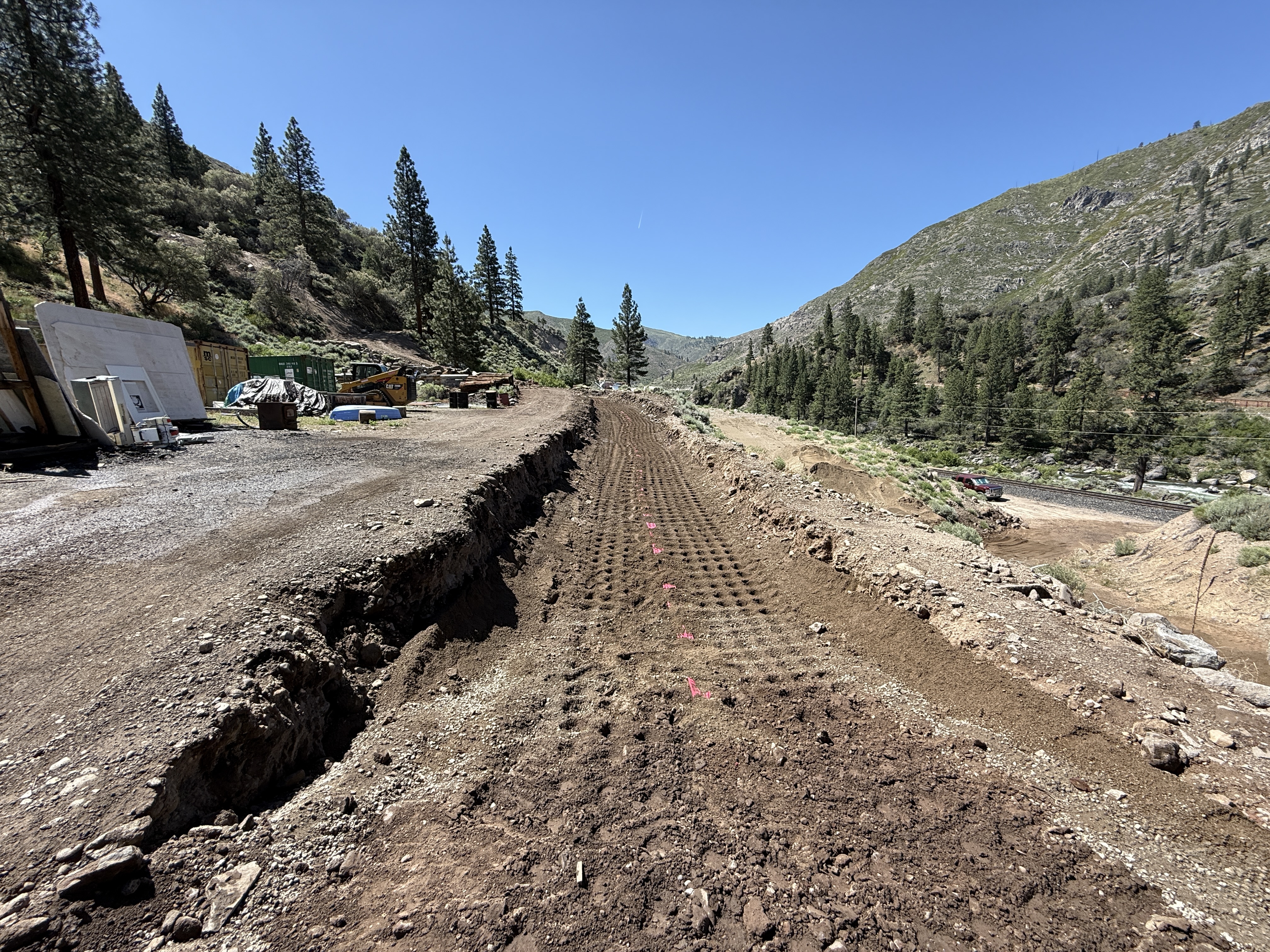 The image shows a site grading preparation activity with a dirt pathway, bordered by cleared gravel and construction machinery. Construction materials are stored on the left side along with heavy equipment. Tire tracks are visible on the dirt surface, indicating recent or ongoing grading work.