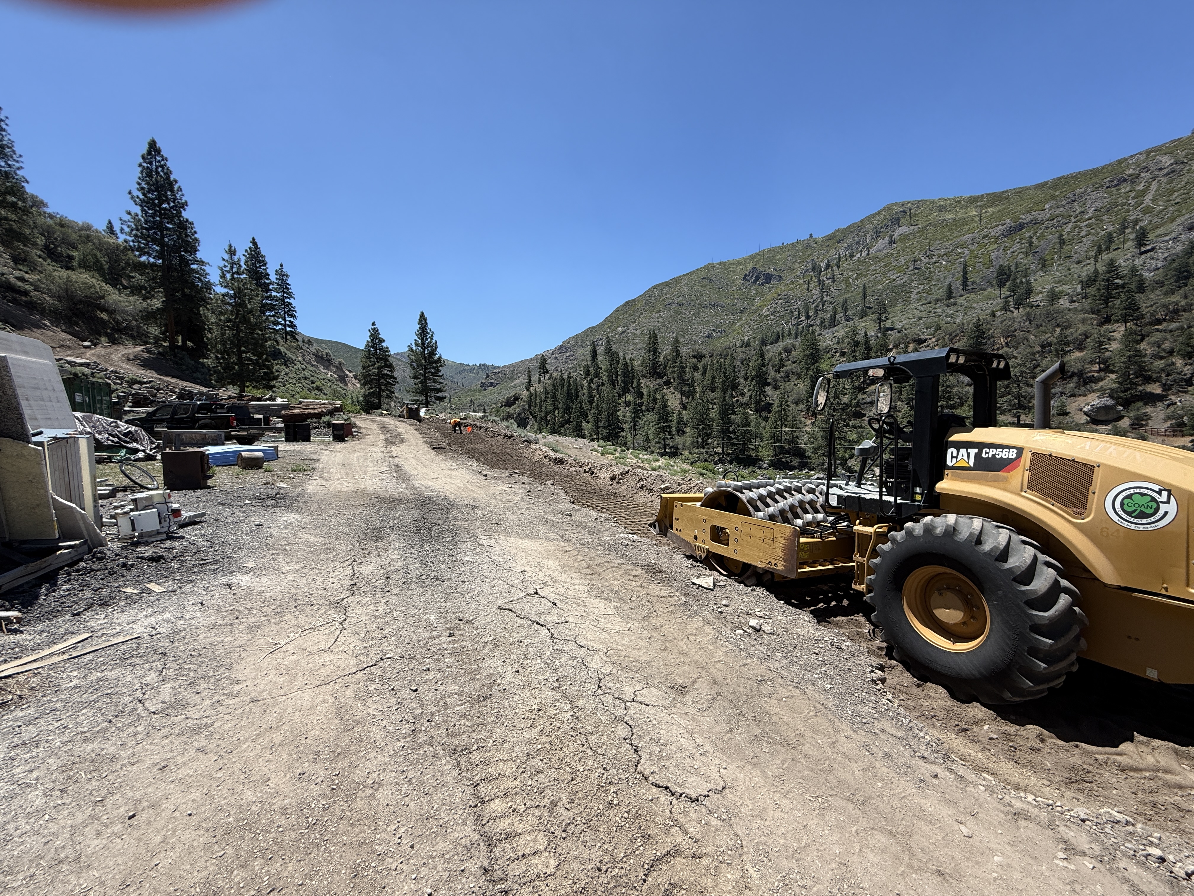 A soil compactor is positioned on the right side of a dirt road in a mountainous area. Construction materials and debris are visible on the left side of the road. The area is open and partially cleared, with clear weather conditions. No trenching or pipeline installations are visible, and there is no active work being performed in the image.