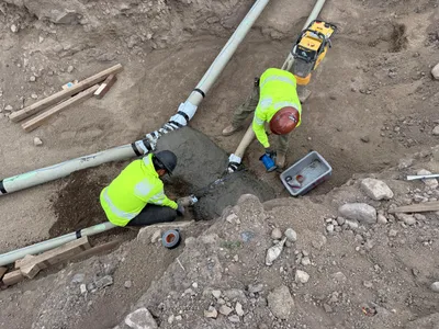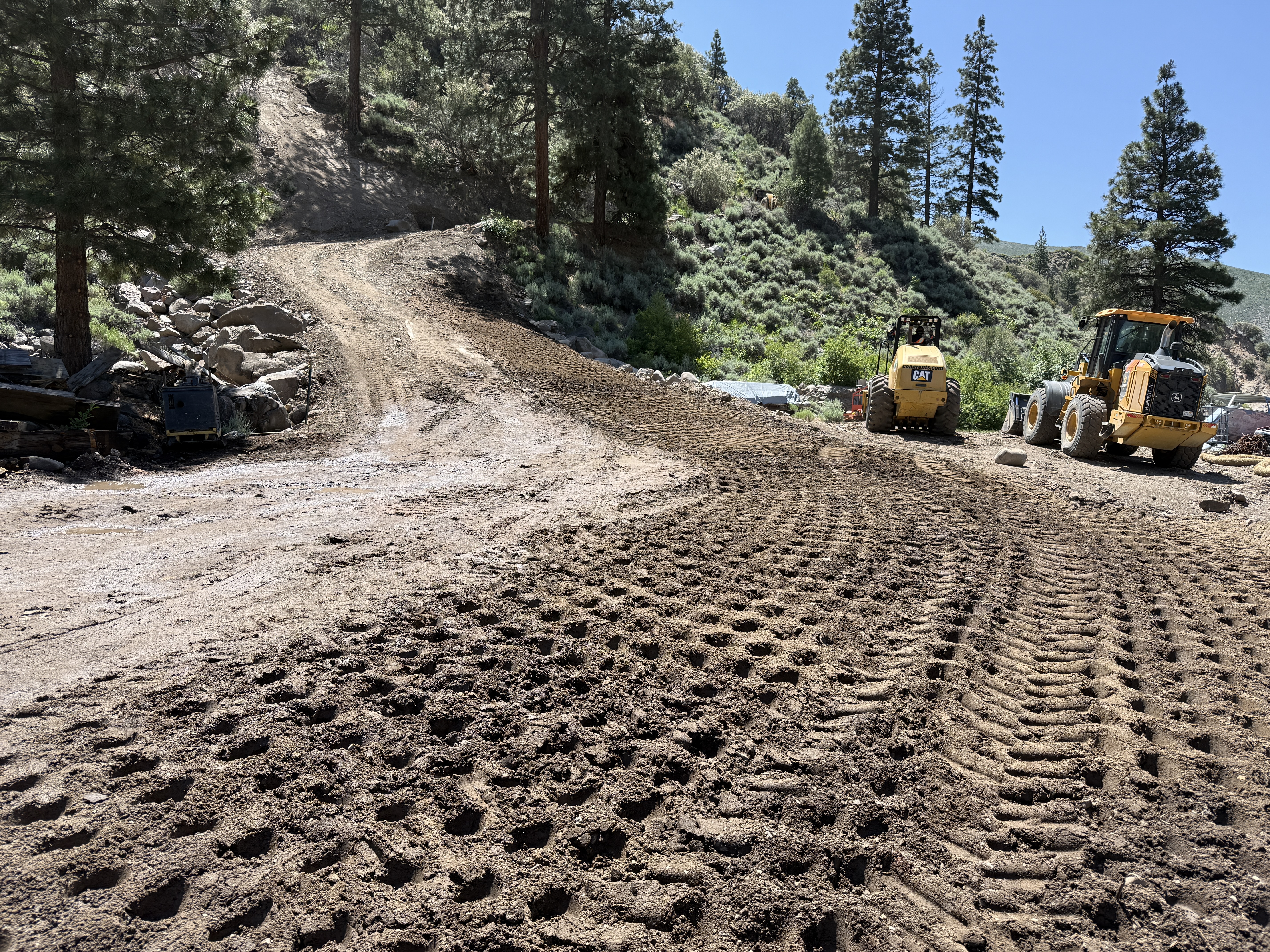 graded dirt with tire marks clear weather, bright lighting open site with visible equipment access