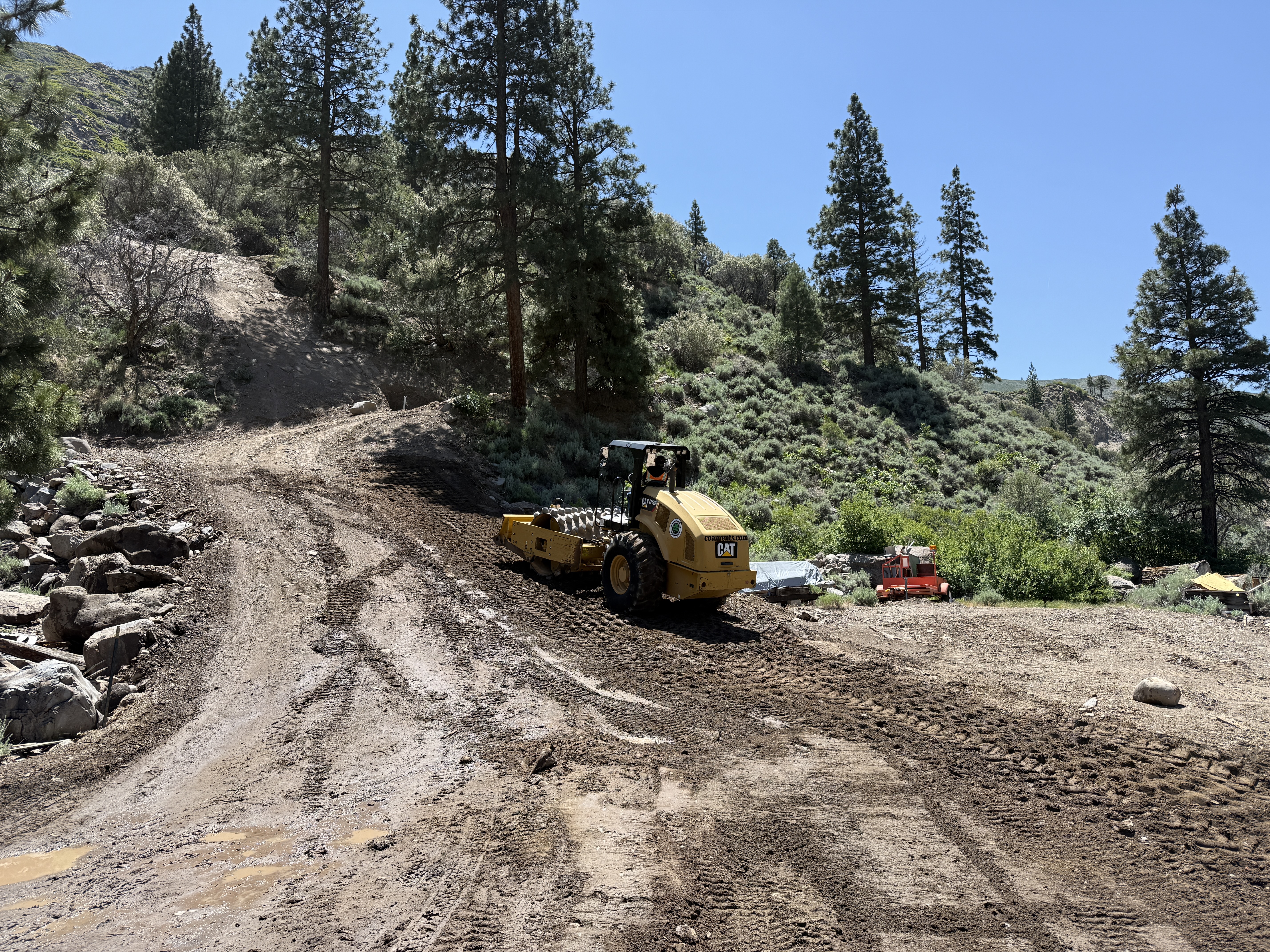 The image shows a yellow road roller compacting the dirt on a pathway surrounded by trees and shrubs. The road roller is positioned on the right side of the slope. In the background, there are additional pieces of construction equipment partially obscured by bushes. The area appears to be in a forested region with uneven dirt terrain.