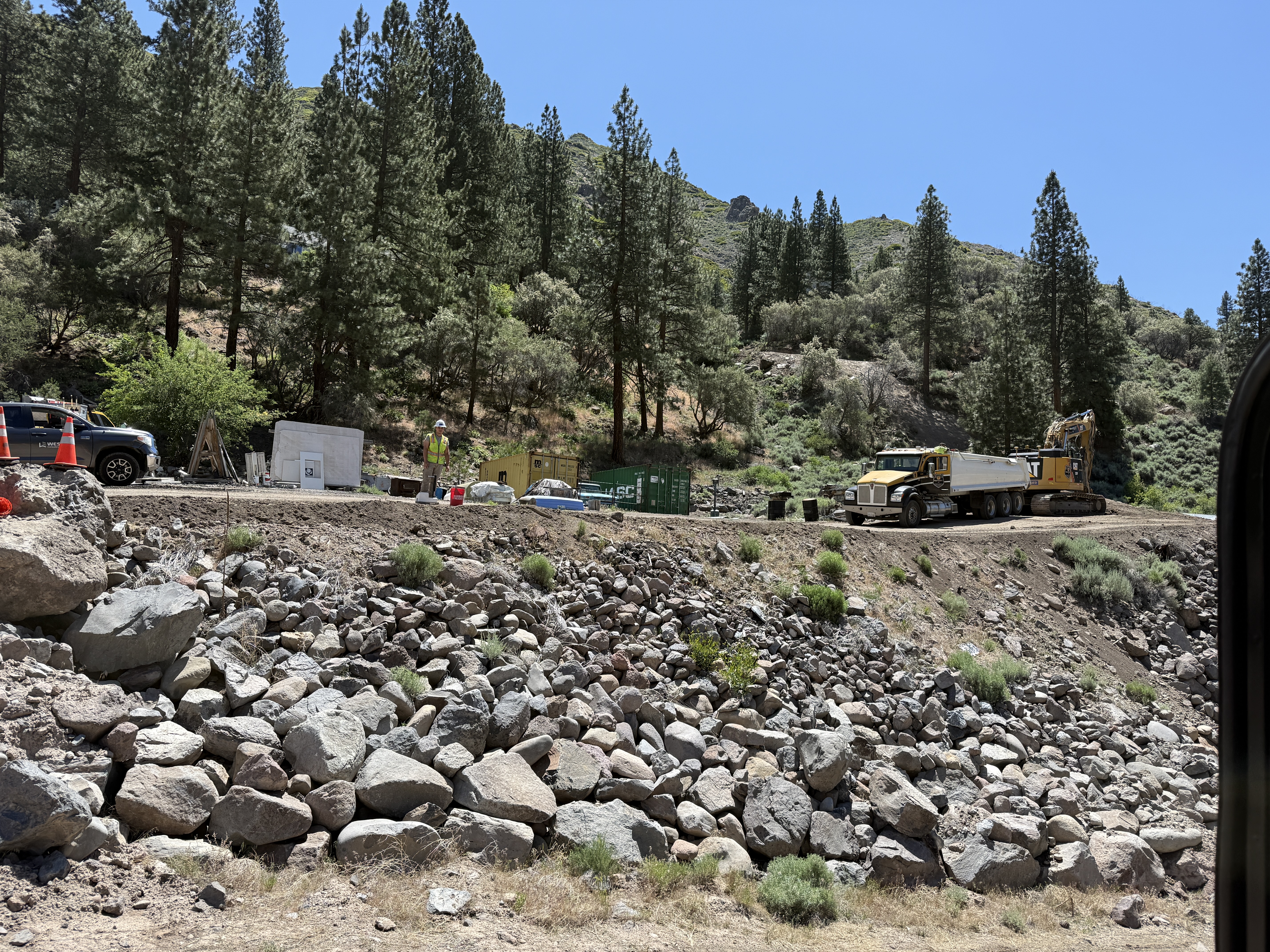 The image shows an excavator positioned on the right side near a dump truck, engaged in earth-moving activities. A worker wearing PPE stands in the area, along with traffic cones and some construction materials. The work area is surrounded by forested hillsides, indicating site grading or excavation. Large rocks are visible in the foreground, suggesting uneven ground conditions.
