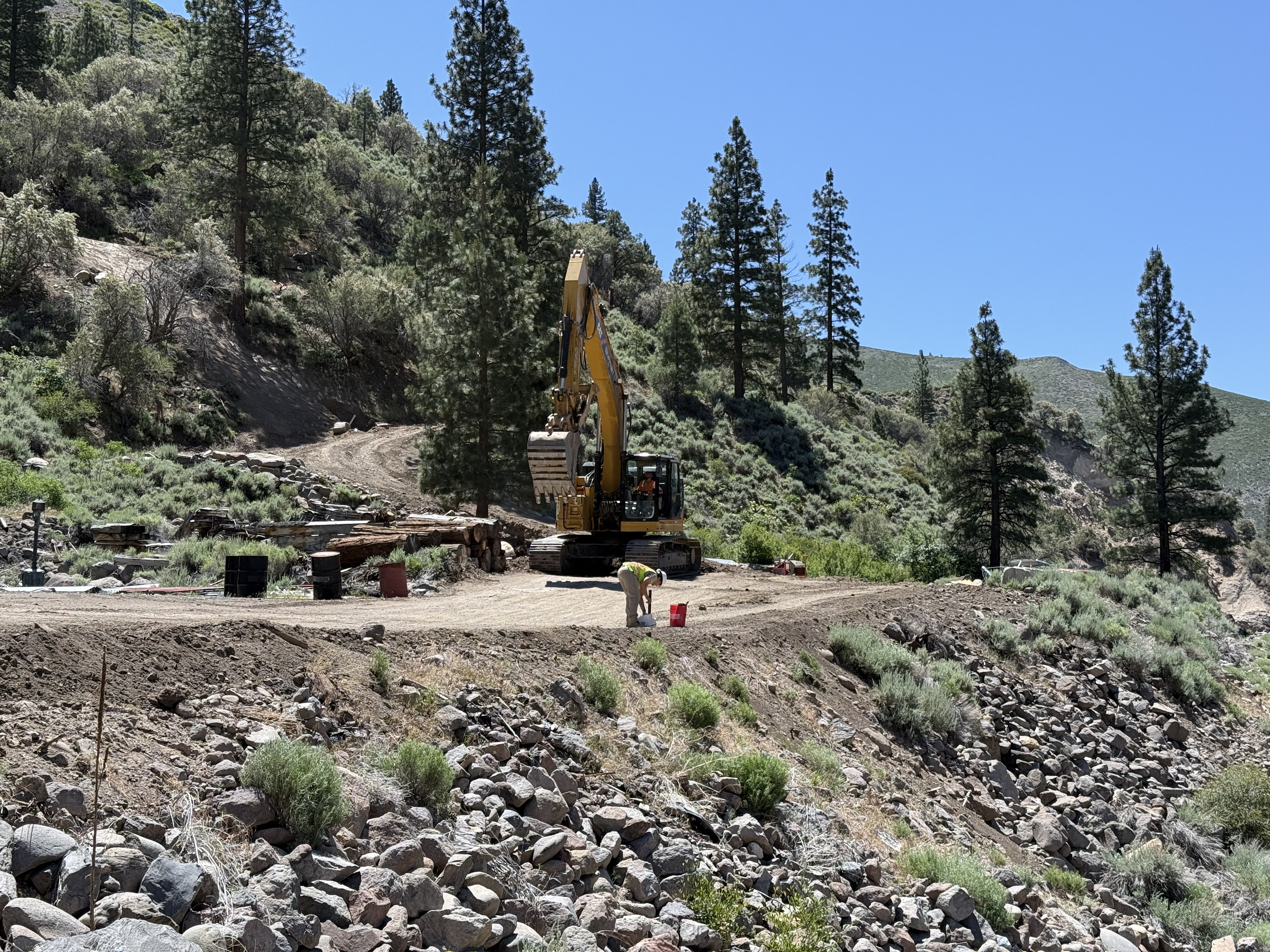 The image shows a construction site with an excavator positioned on a dirt road surrounded by trees and rocky terrain. A person is near the center of the scene potentially handling materials or tools. The area appears to be prepared for further construction activities, with several barrels scattered around. Landscaped earth suggests site grading activities.