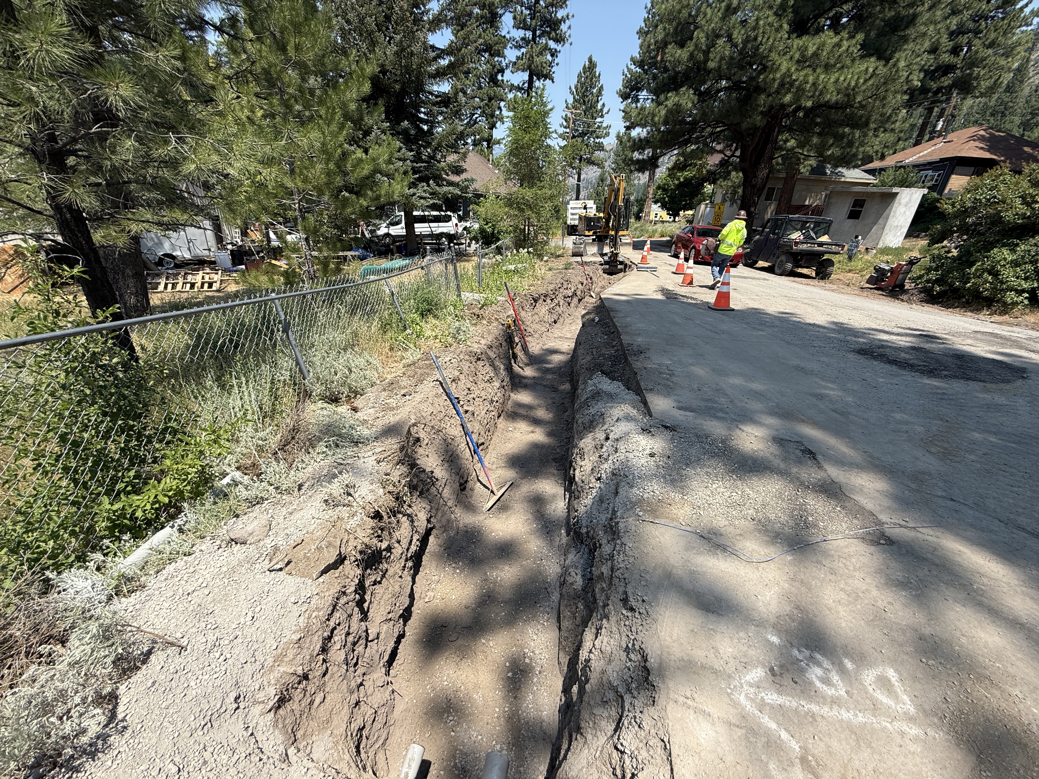 The image shows a trench running parallel to a road, with construction workers present. Traffic cones are placed along the trench, and a small excavator is working near the site. The area is surrounded by trees and a fence runs adjacent to the trench. A few vehicles and construction equipment are in the background.