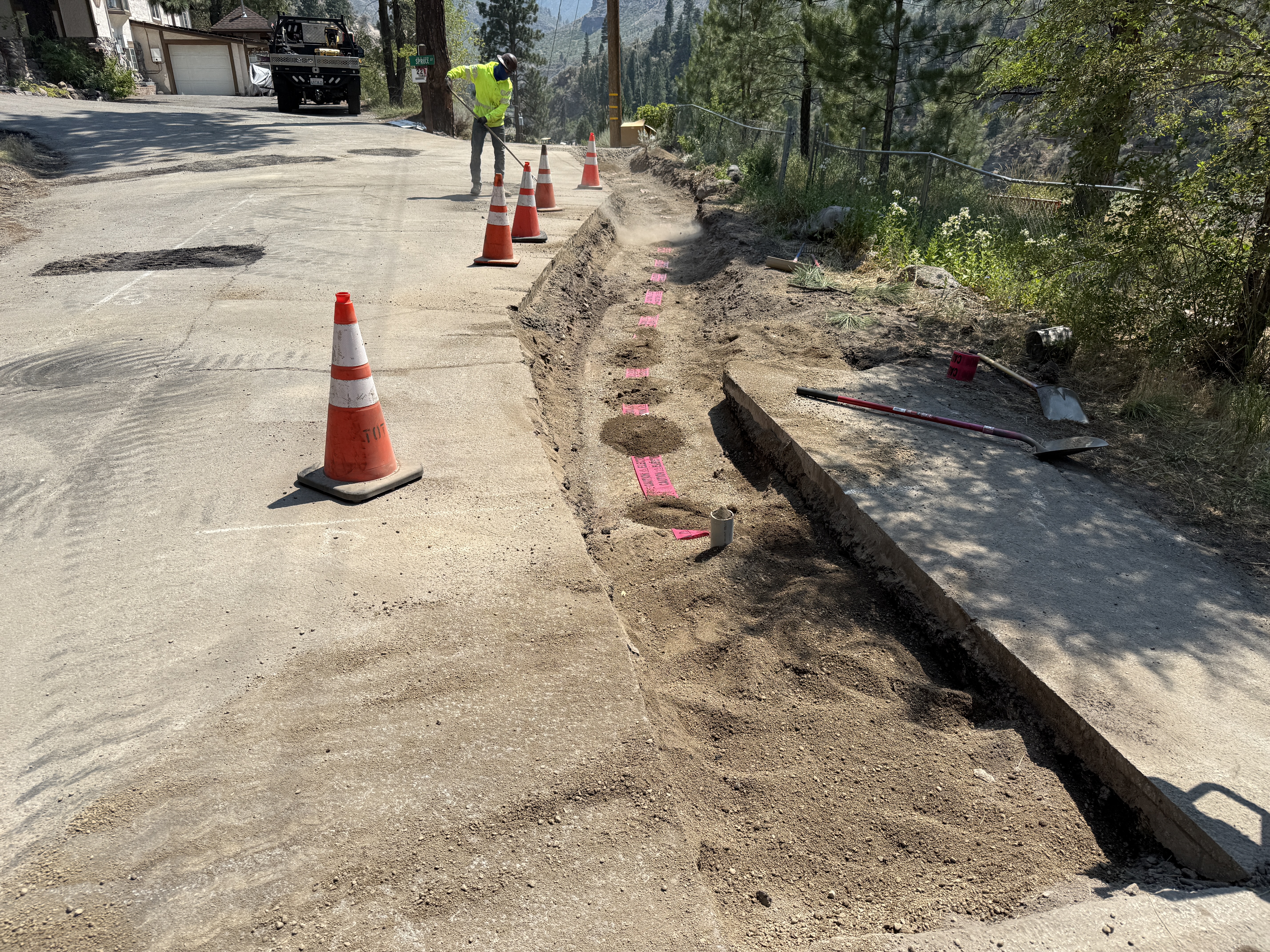 A worker wearing a hi-vis vest is visible managing a trench along the road's edge. Traffic cones are set up for safety, and there are hand tools like shovels on-site. The trench is beside a concrete pavement with adjacent trees and vegetation. This appears to be part of trenching work likely for utility installation.