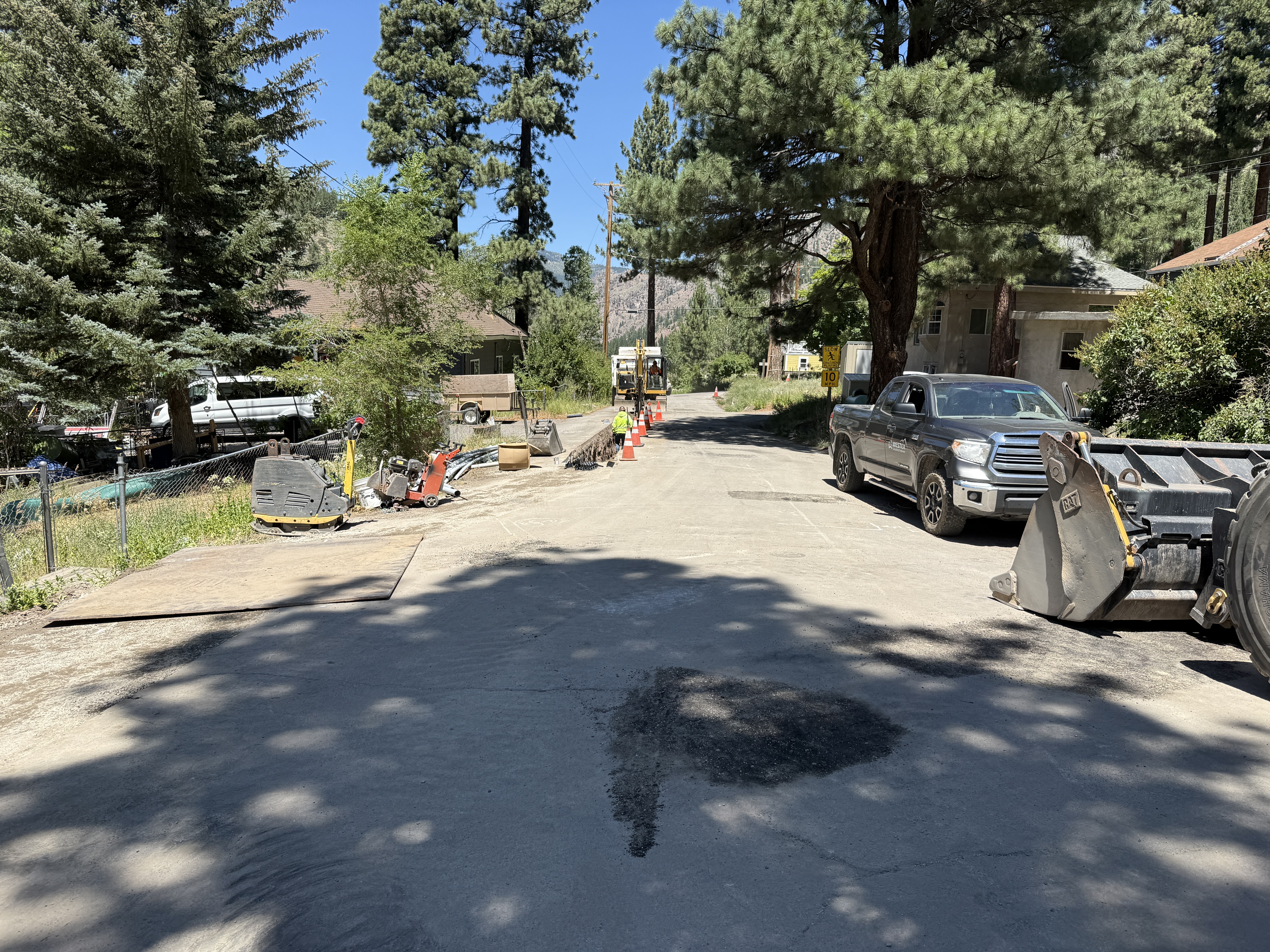 paved road surface bright daylight with tree shadows equipment and vehicle staged on roadside