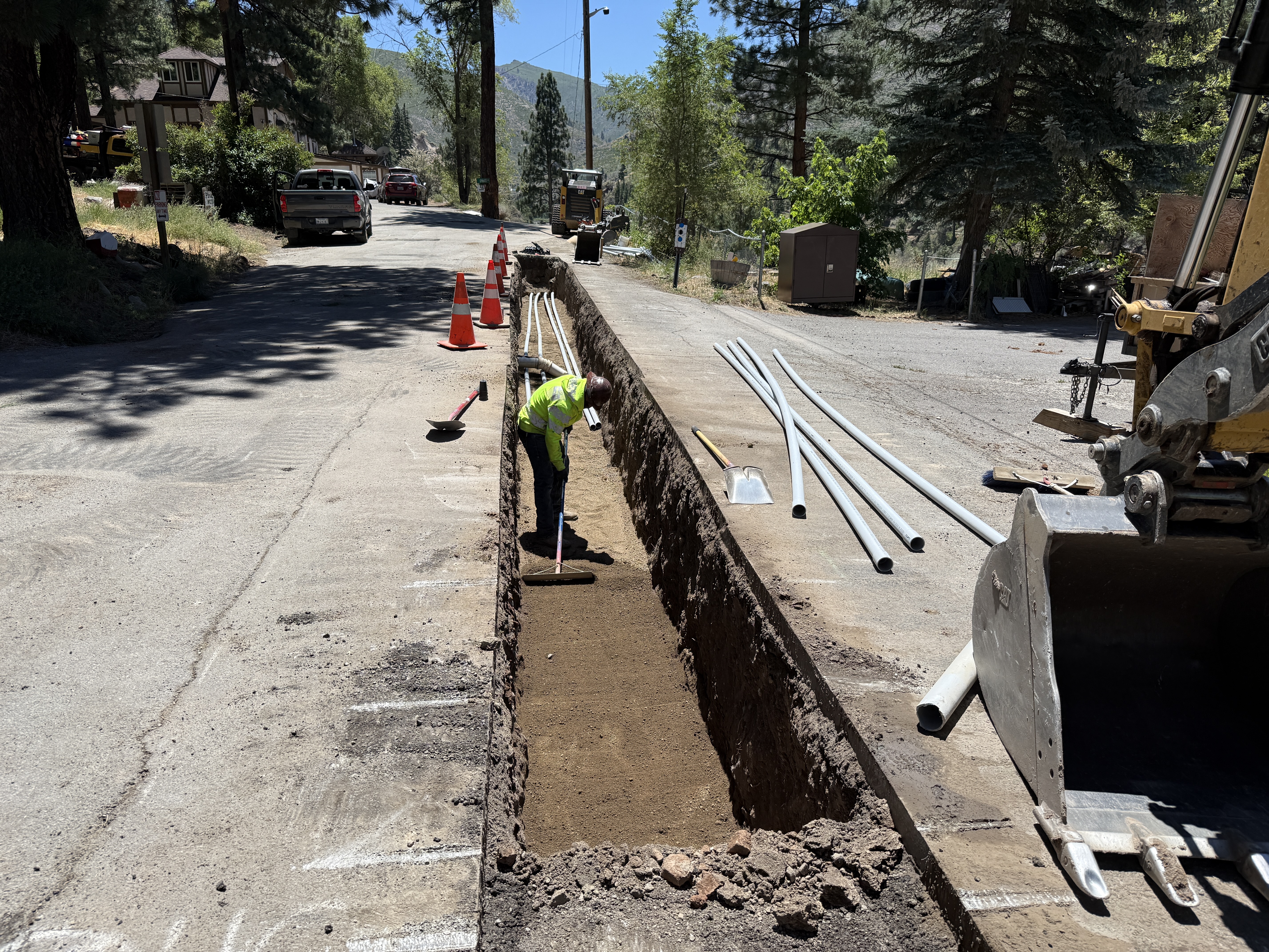 A worker is leveling the base of a trench alongside several PVC conduits on the ground. An excavator is stationed nearby with its bucket parked at the trench's edge. Orange traffic cones are placed along the trench for safety. The trench is on a suburban street with some vehicles parked along the side. Sunny weather conditions are observed.