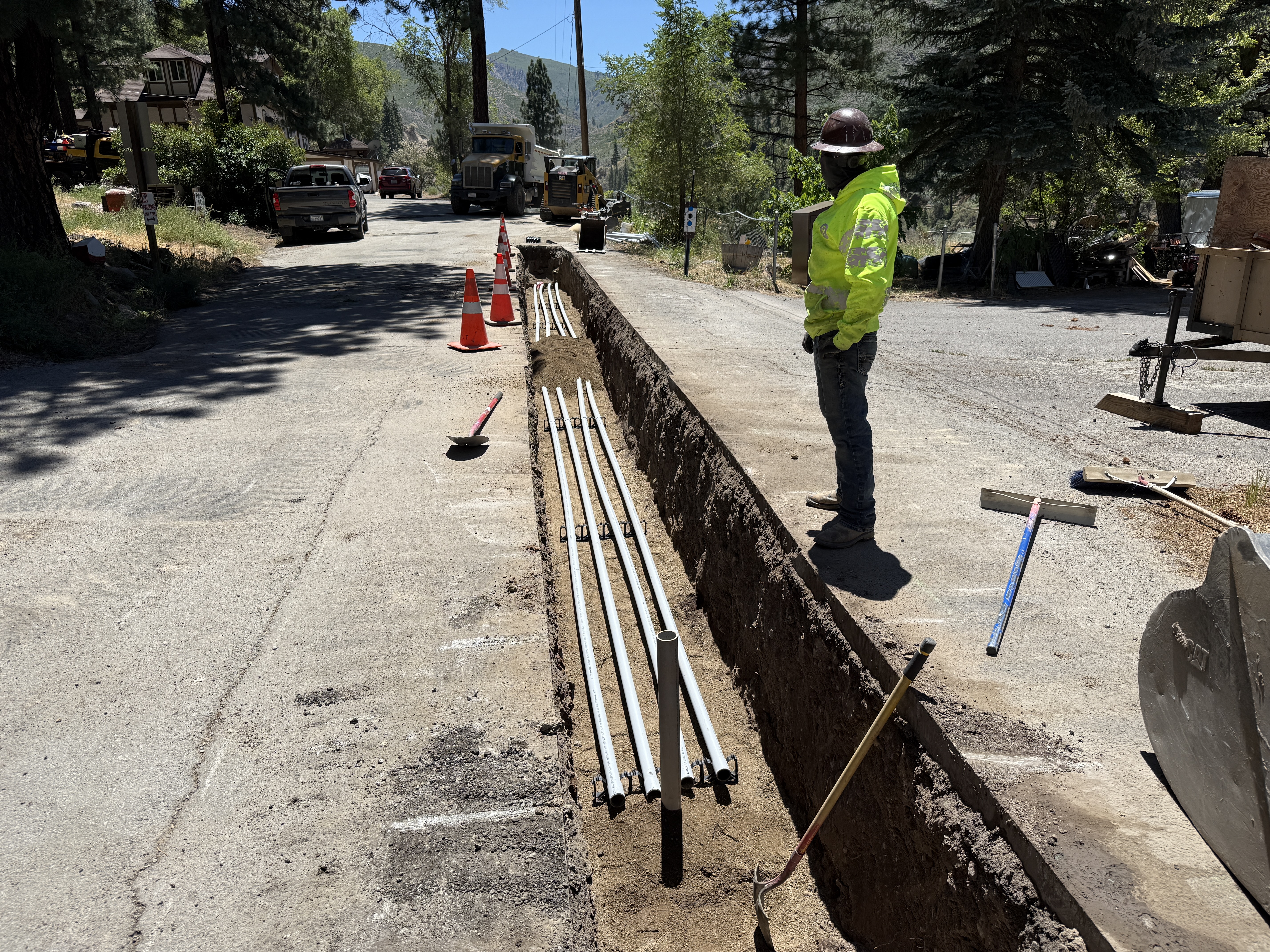 A trench is visible alongside a road, with a person in safety attire standing nearby. Several conduits are laid in the trench, indicating ongoing installation work. Traffic cones are used to mark the trench area. A few parked vehicles and some construction equipment are visible at a distance.