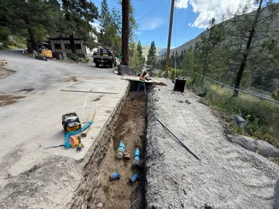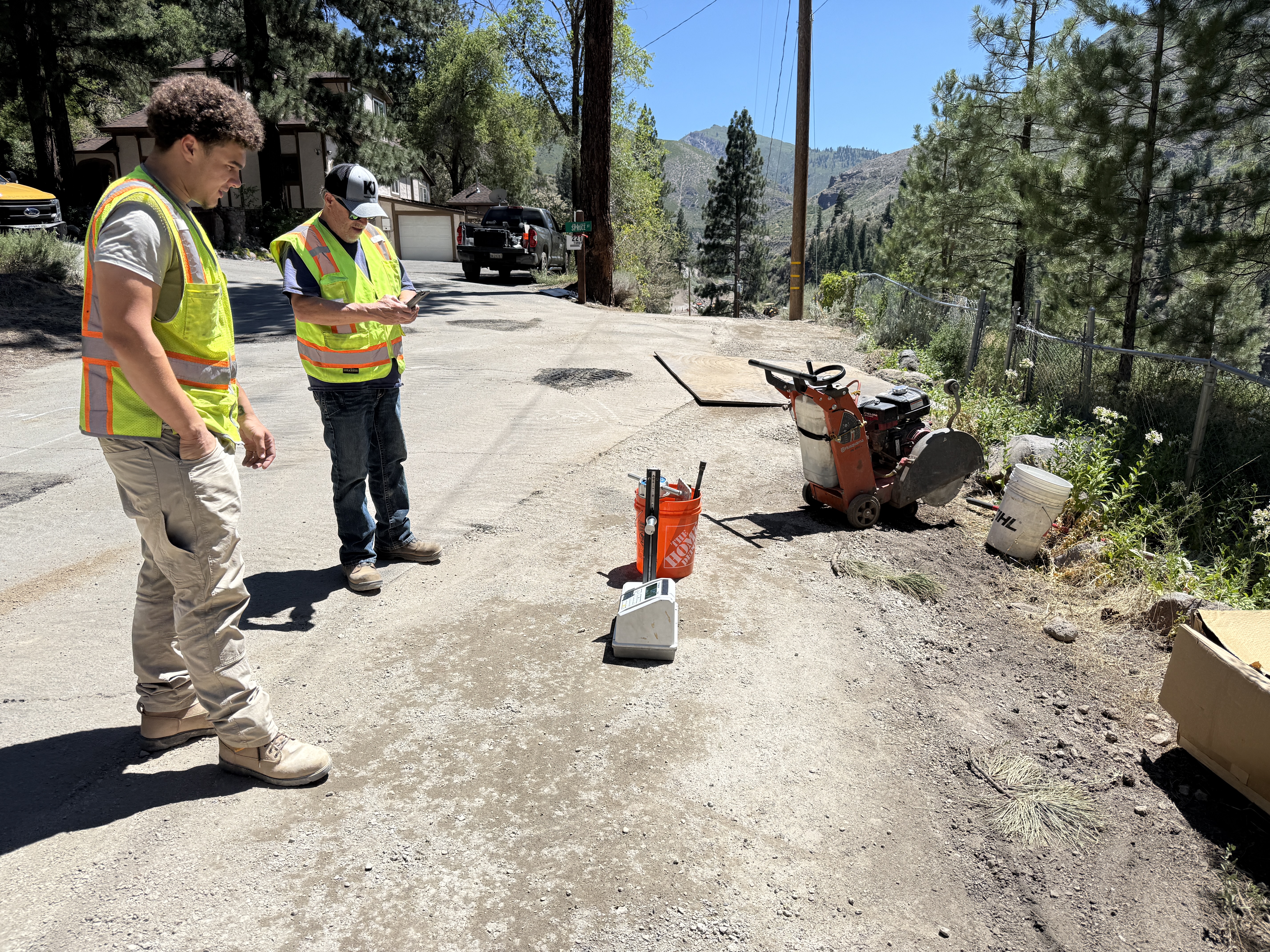 The image shows two construction workers standing on a paved road, wearing high-visibility vests and work boots. Positioned close to them is a pavement saw, likely used for cutting the asphalt of the road surface. A couple of orange buckets and miscellaneous hand tools are placed nearby. The area is surrounded by trees with a clear sky above, suggesting good weather. It is unclear whether any active road cutting is ongoing or the equipment is staged for future work.