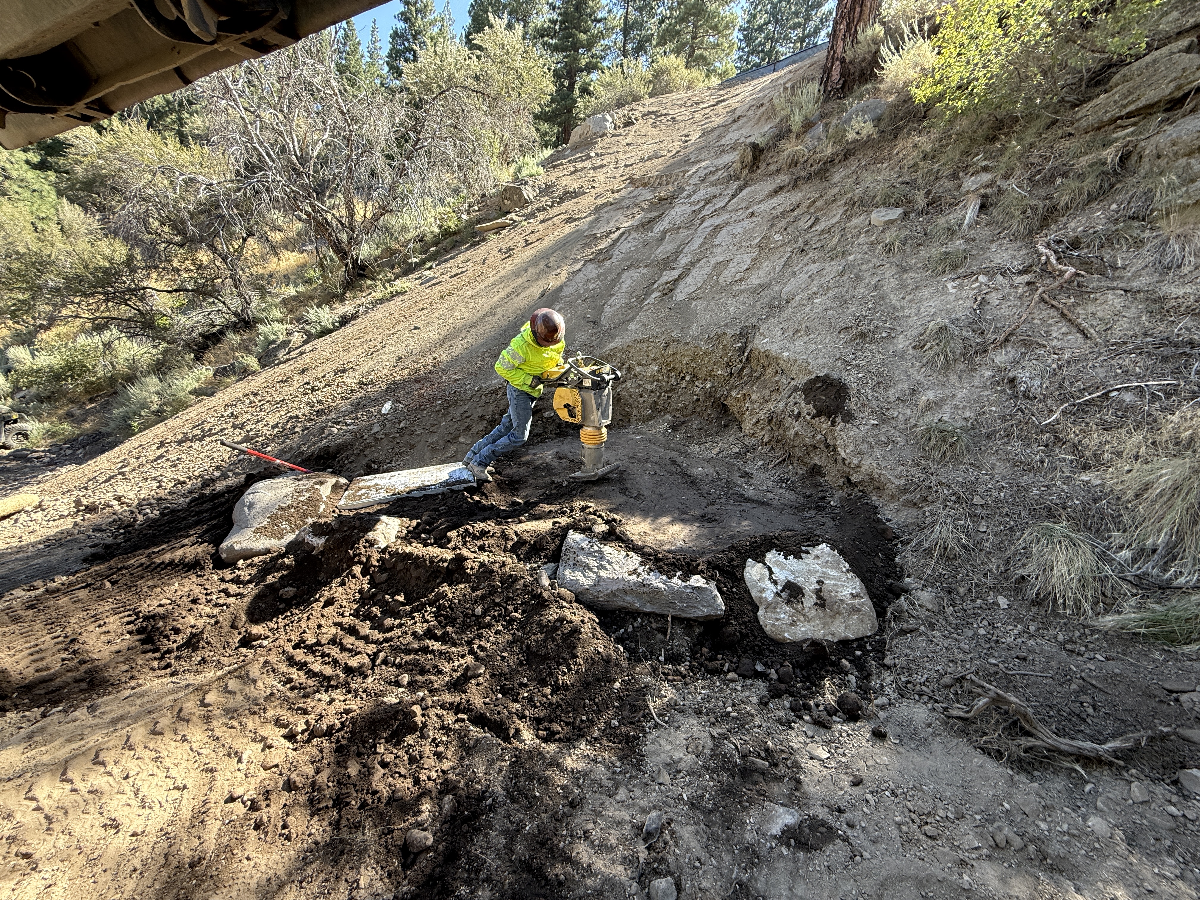 A worker is operating a tamping tool to compact soil on a sloped terrain. Concrete fragments and loose soil are scattered in the work area. The scene is surrounded by natural vegetation, indicating the location is outdoors. There is a visible slope that poses a terrain challenge.