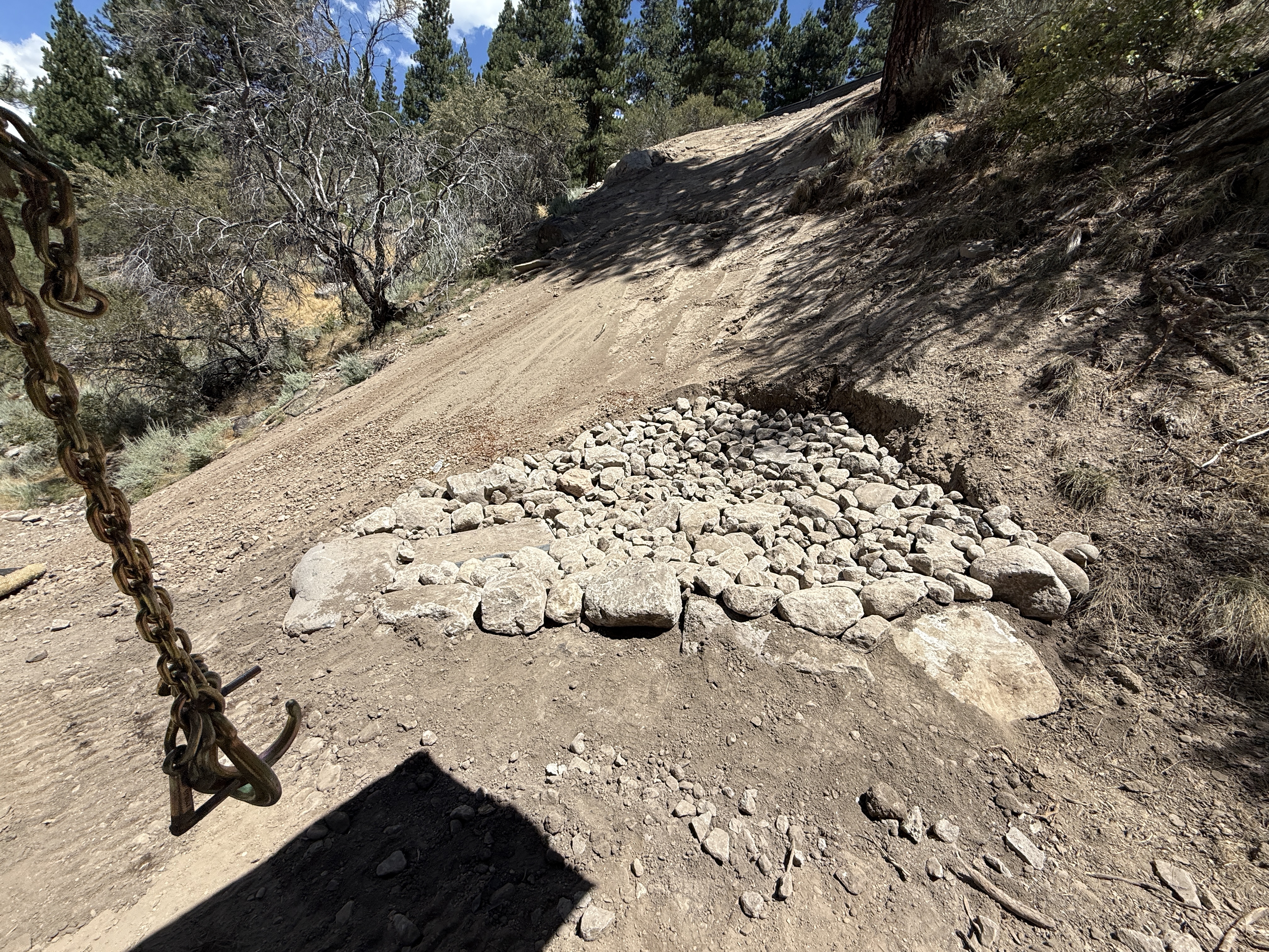 The image depicts a slope where rocks have been arranged, likely for erosion control purposes. A chain is visible suspended from the top left corner, suggesting possible recent movement of materials. Trees and shrubs surround the area, providing context of a natural environment. The ground surface is largely dirt, with visible signs of disturbance.