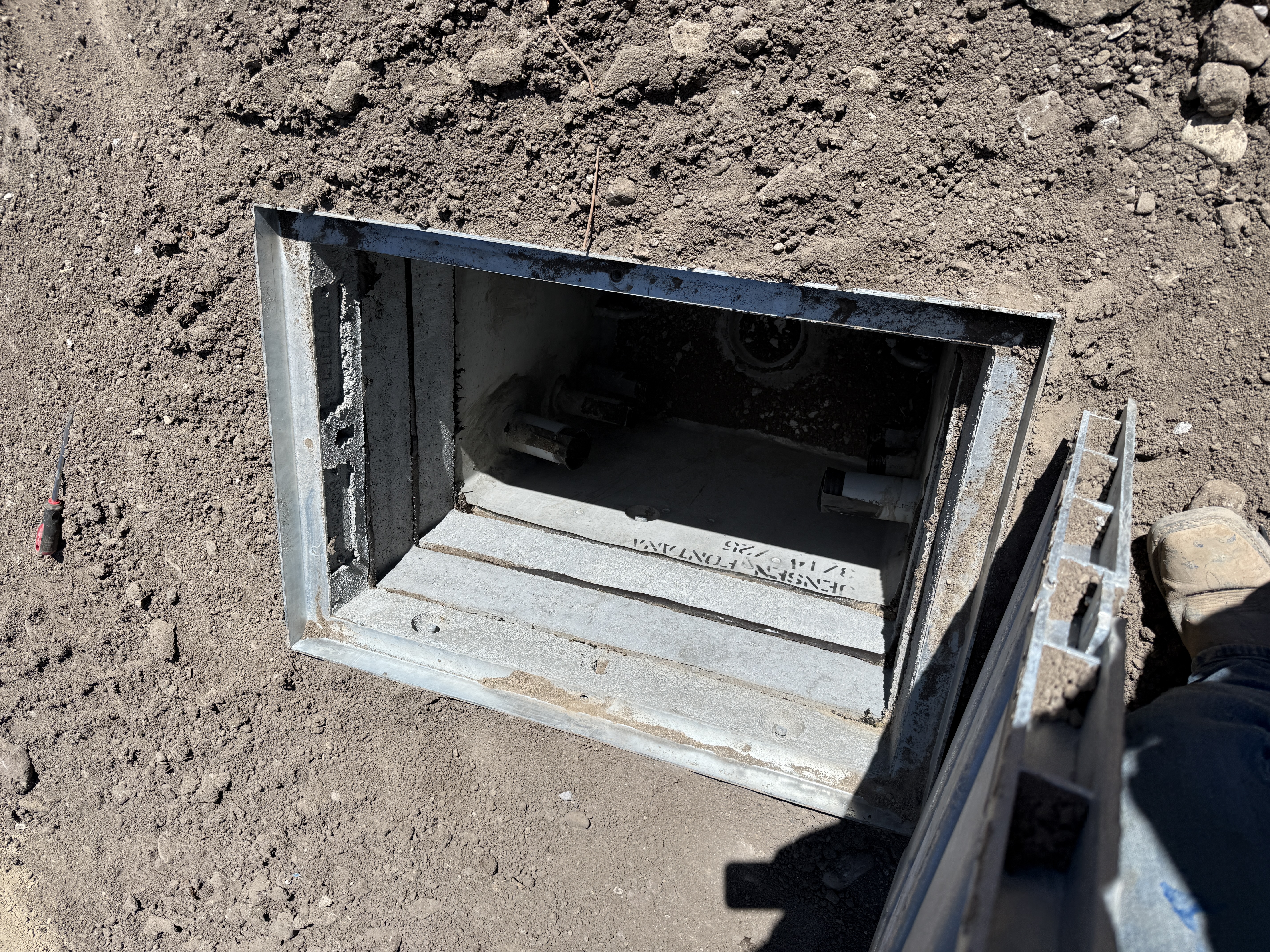 A rectangular utility box or vault is open in the ground, with dirt surrounding it. Inside the box, some piping and components are visible. A screwdriver is positioned on the surrounding soil surface. The ground appears to be level around the box, and there are no barriers or covers visible on the vault.