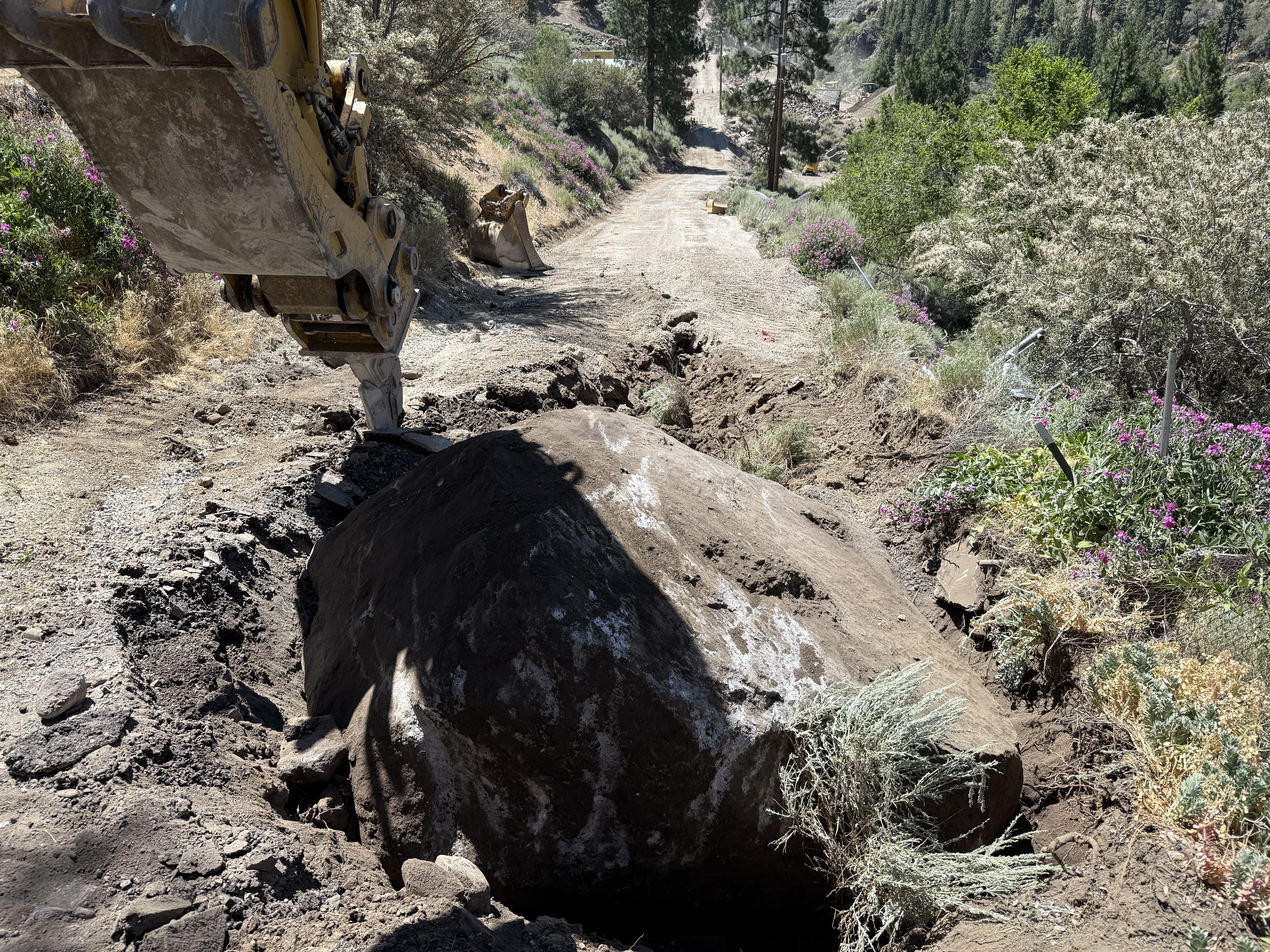 The image shows an excavator actively engaged in removing a large boulder from a dirt road or a similar unpaved surface. The boulder is partially embedded in the ground with surrounding disturbed earth and plant life. There are dirt slopes on either side of the road, and the excavator is positioned on the left side. Vegetation, including shrubs and flowers, is visible along the roadside.