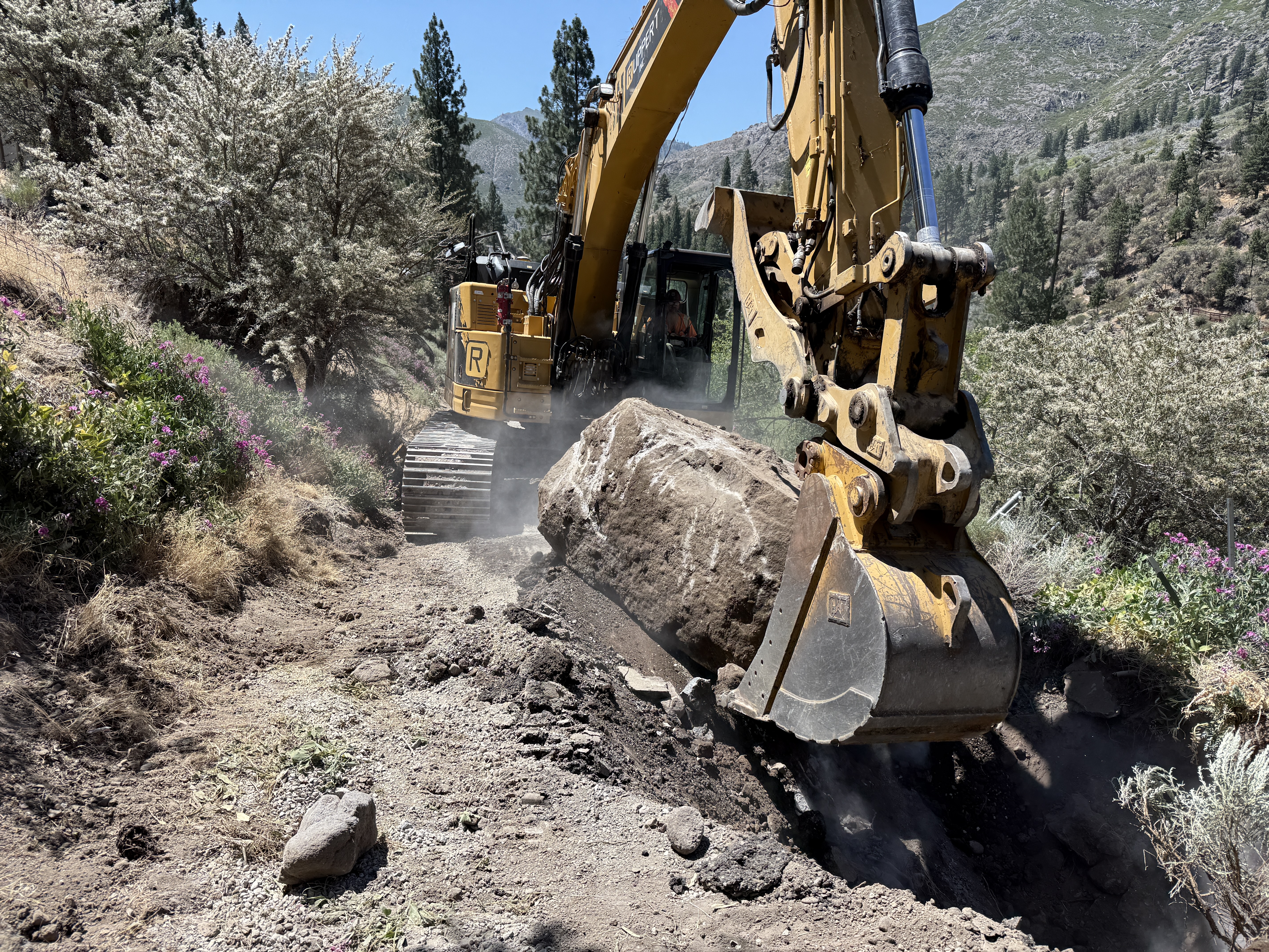 A heavy excavator is operating on a dirt slope, using its bucket to handle a large boulder. The background shows a natural setting with trees and shrubs. The ground looks disturbed, suggesting recent excavation or earthwork. Dust is present, likely from the movement of soil and rocks.