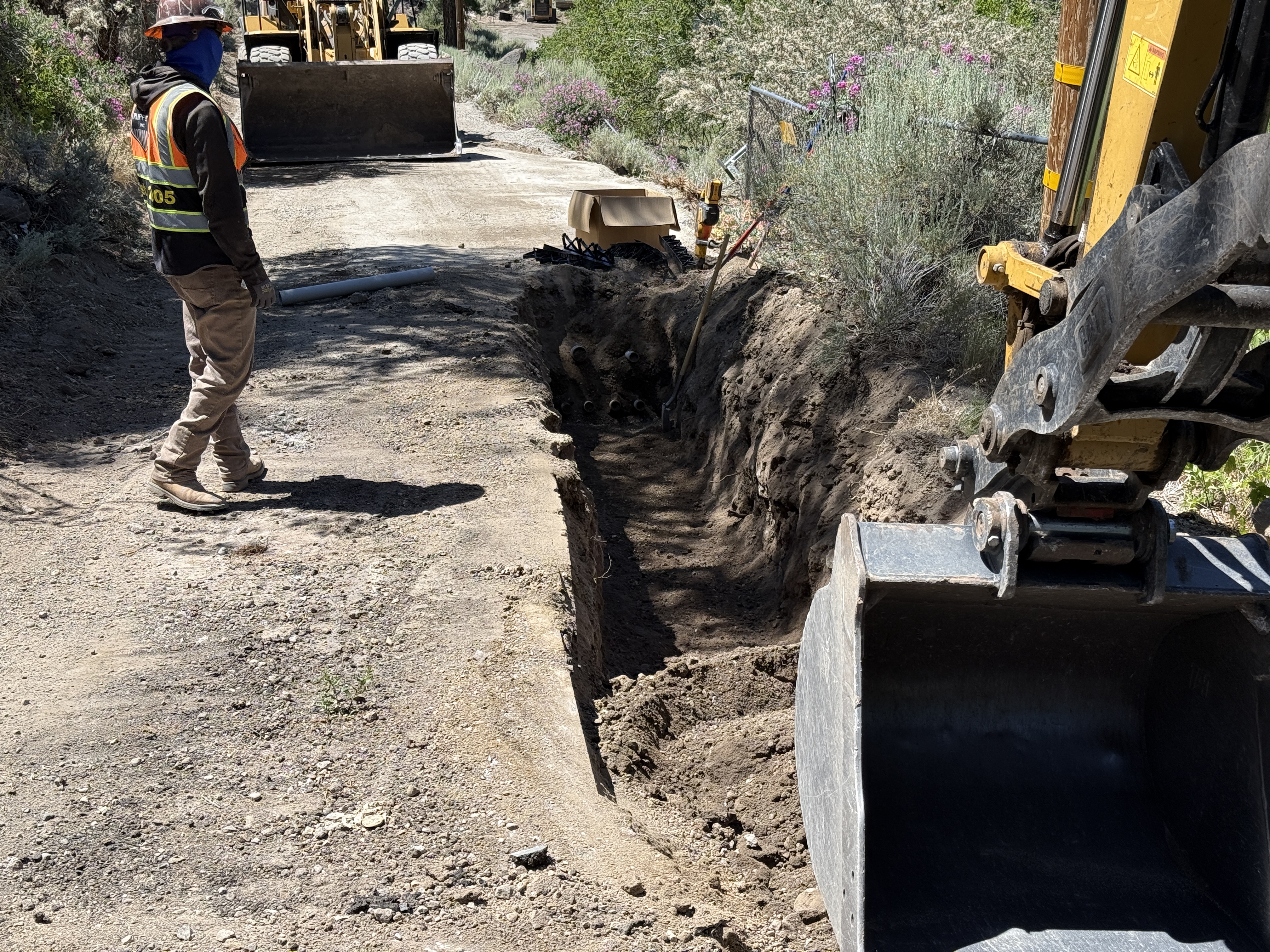 The image shows an excavator actively digging a trench alongside a dirt road. A construction worker wearing PPE stands nearby, observing the work. Pipes and some construction materials can be seen near the trench. Vegetation is visible alongside the area, indicating an outdoor location.