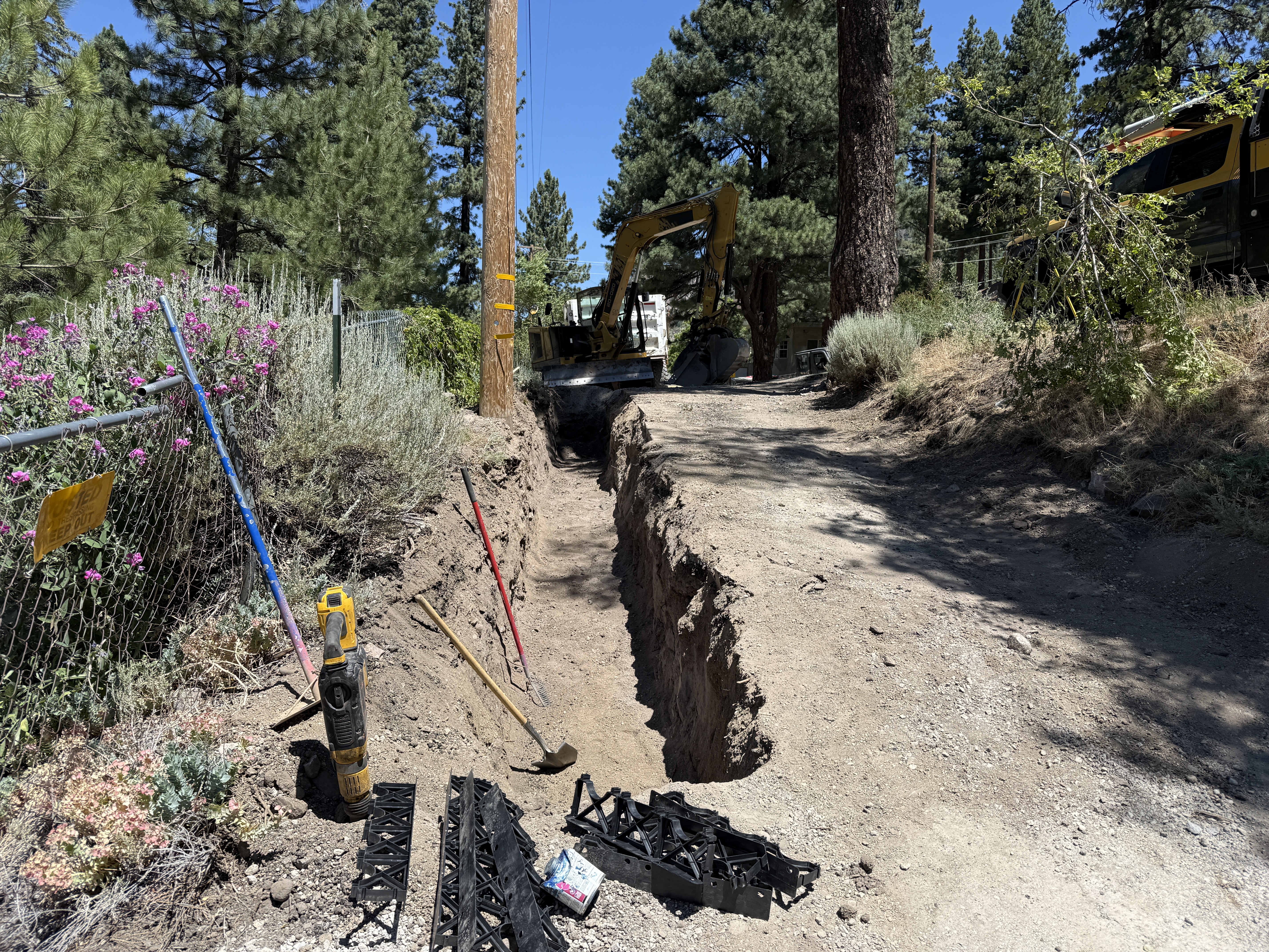 An open trench runs along a dirt path, with a yellow excavator positioned near the trench. Hand tools like a shovel and a post-hole digger are visible beside the trench. Black plastic components and a power tool are also present, indicating trench preparation or utility installation. The area is surrounded by trees and a chain-link fence with warning signs.
