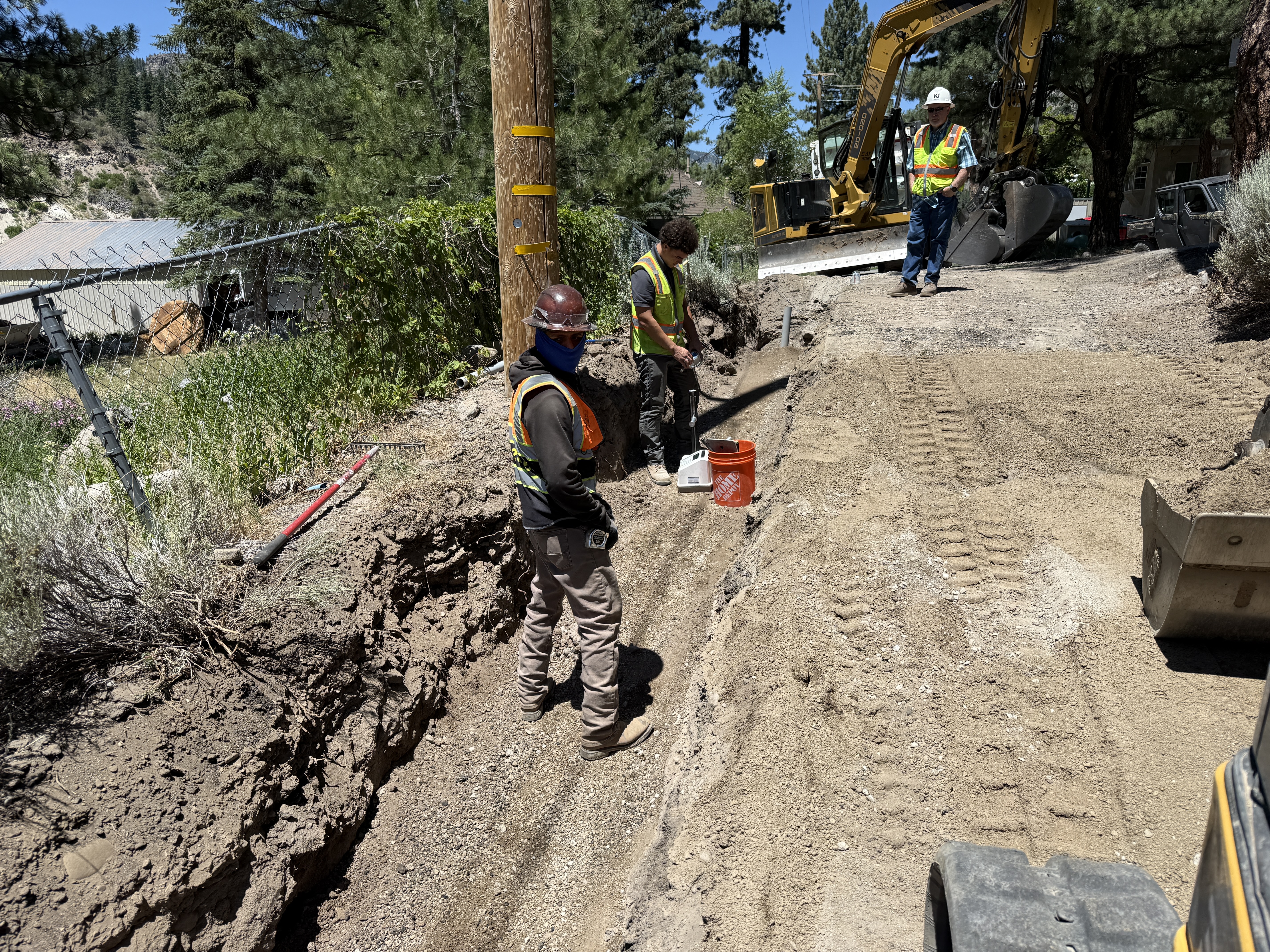 dirt with visible trench sunny sufficient access with equipment spaced around trench