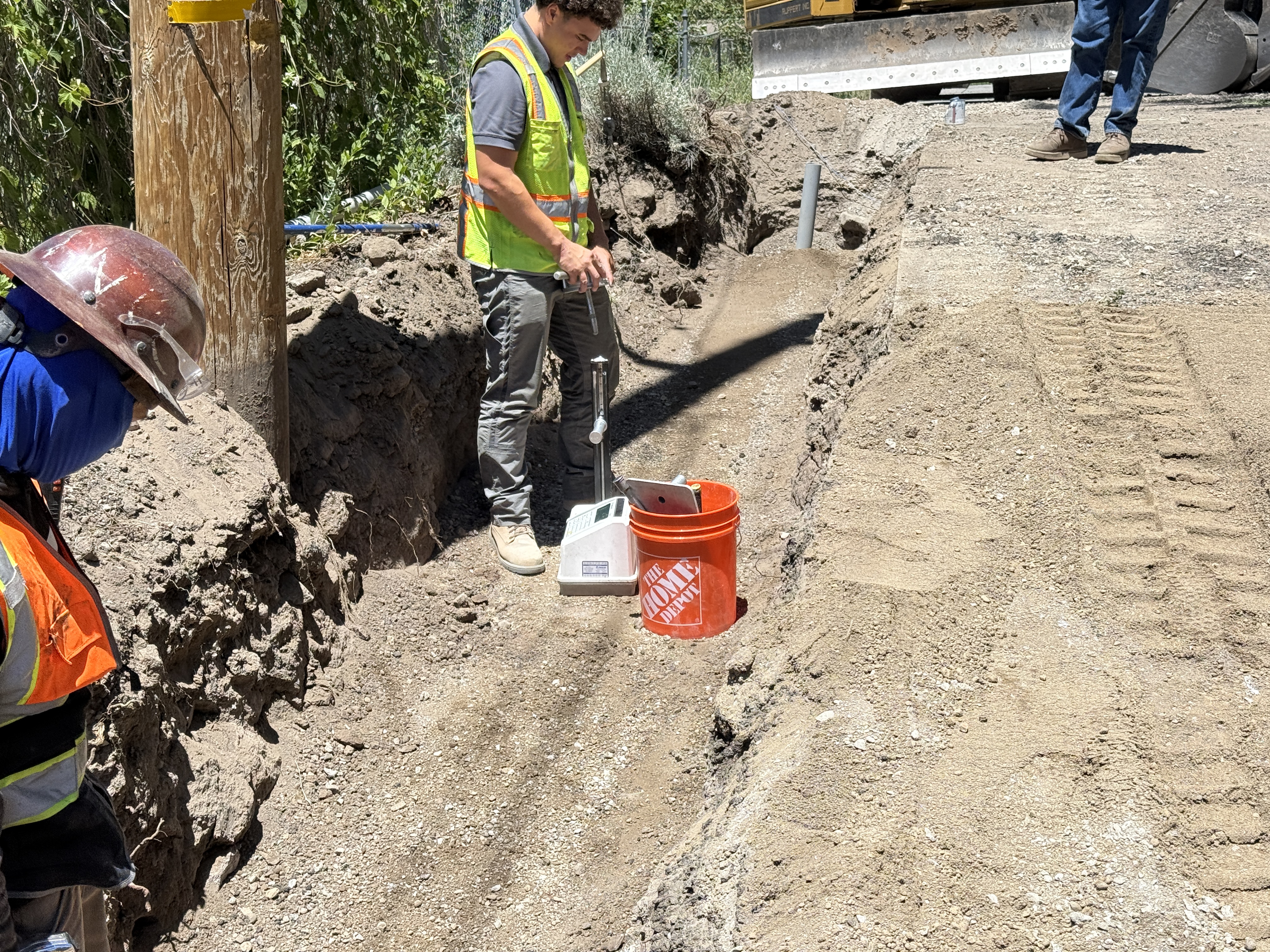 The image shows a worker conducting inspection or testing on a trench with a soil compaction device. The trench runs parallel to a wooden utility pole. An orange bucket is placed nearby. A worker is wearing a hi-vis vest and work boots, standing beside a soil inspection tool. Another worker is partially visible wearing a hard hat and hi-vis vest.