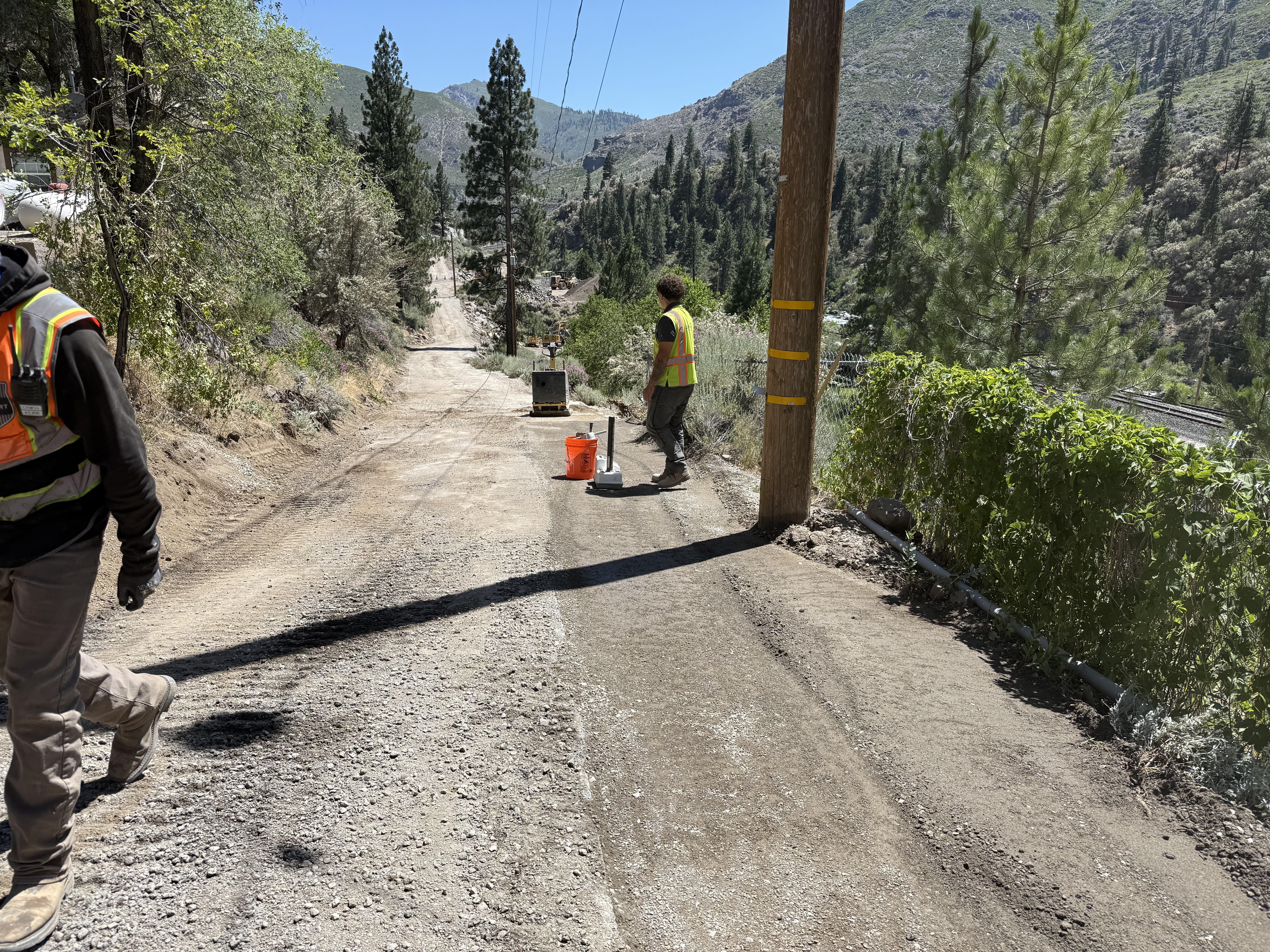 Two workers wearing safety gear are present on a graded dirt road. One worker is walking near a utility pole, and there are traffic cones and a bright colored bucket placed on the road near them. The surrounding area has trees and shrubs. This appears to be part of a preparation or maintenance phase in a rural location.