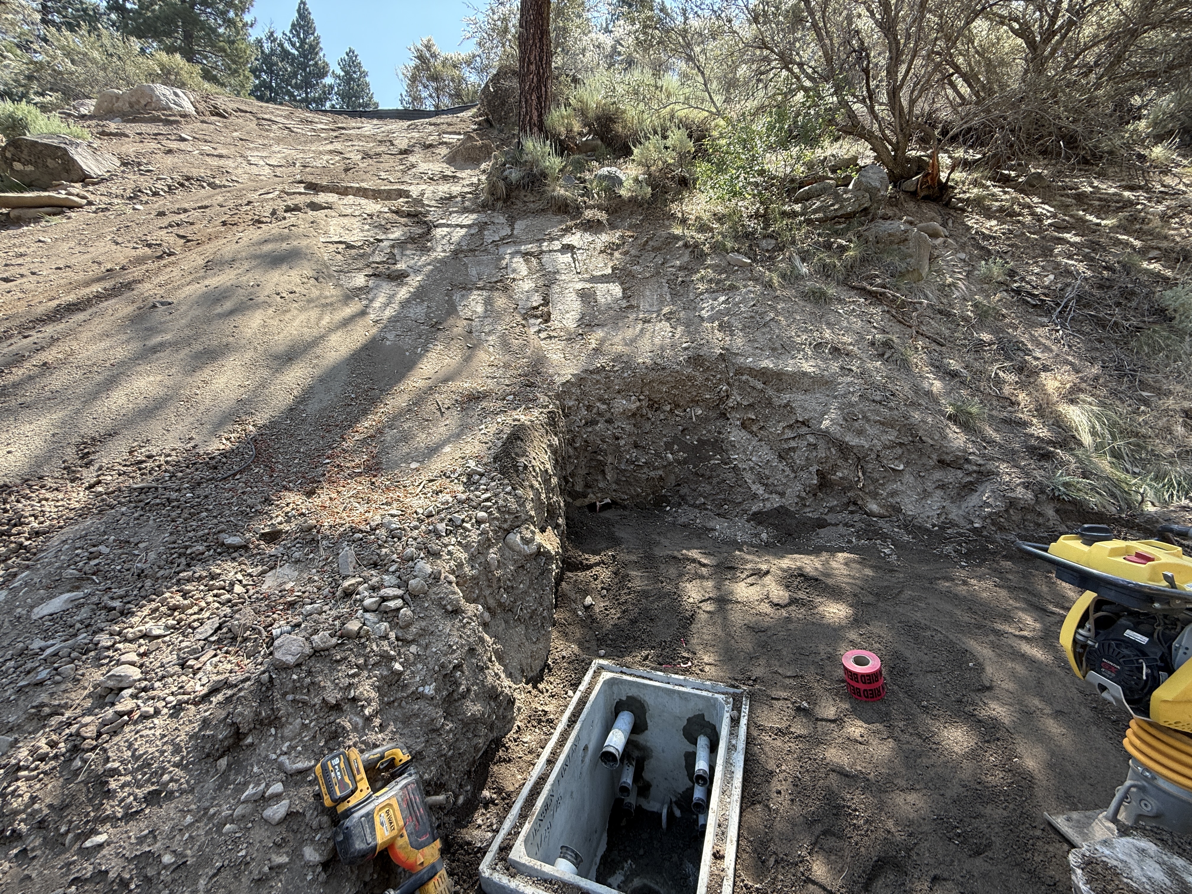 The image shows excavation work with a utility box in the foreground, partially embedded in the ground. A power drill lies nearby on the left side, and a compactor is present on the right. The area is on a slope with rough soil and scattered rocks. The surroundings are natural with trees and vegetation visible uphill.