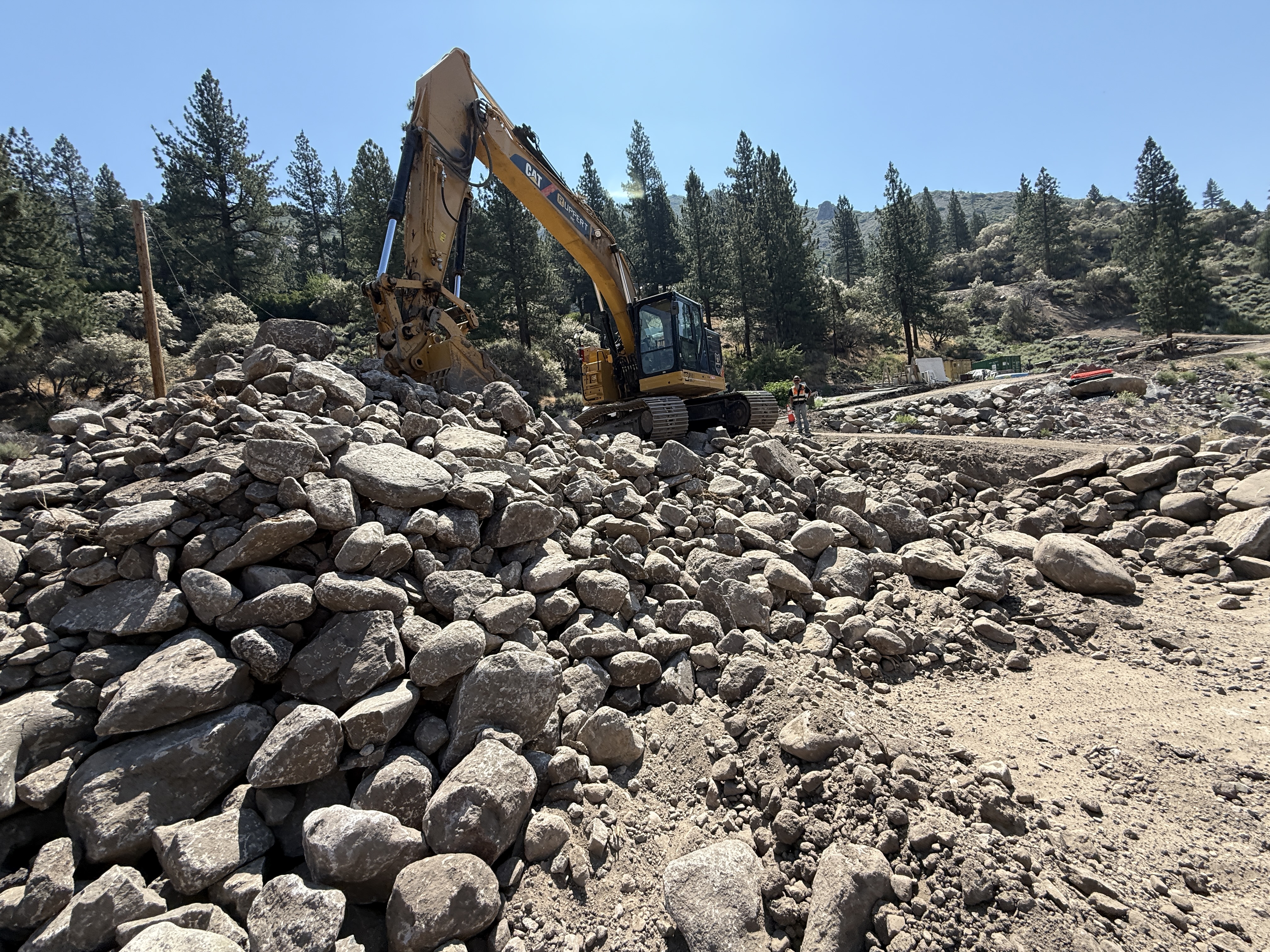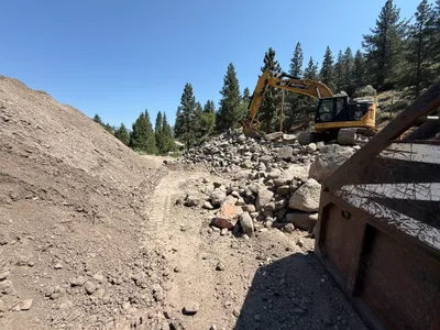 The image shows an excavator working amidst a large pile of rocks in an open area with trees in the background. A worker wearing PPE is standing nearby. The excavator appears to be clearing or organizing the rocks. The surroundings include trees and some construction equipment in the distance.