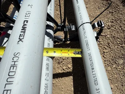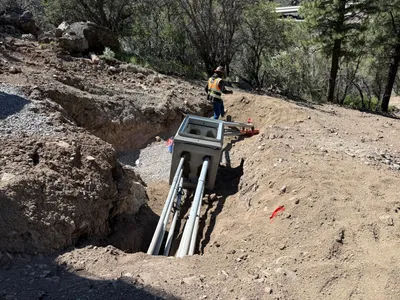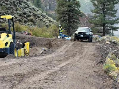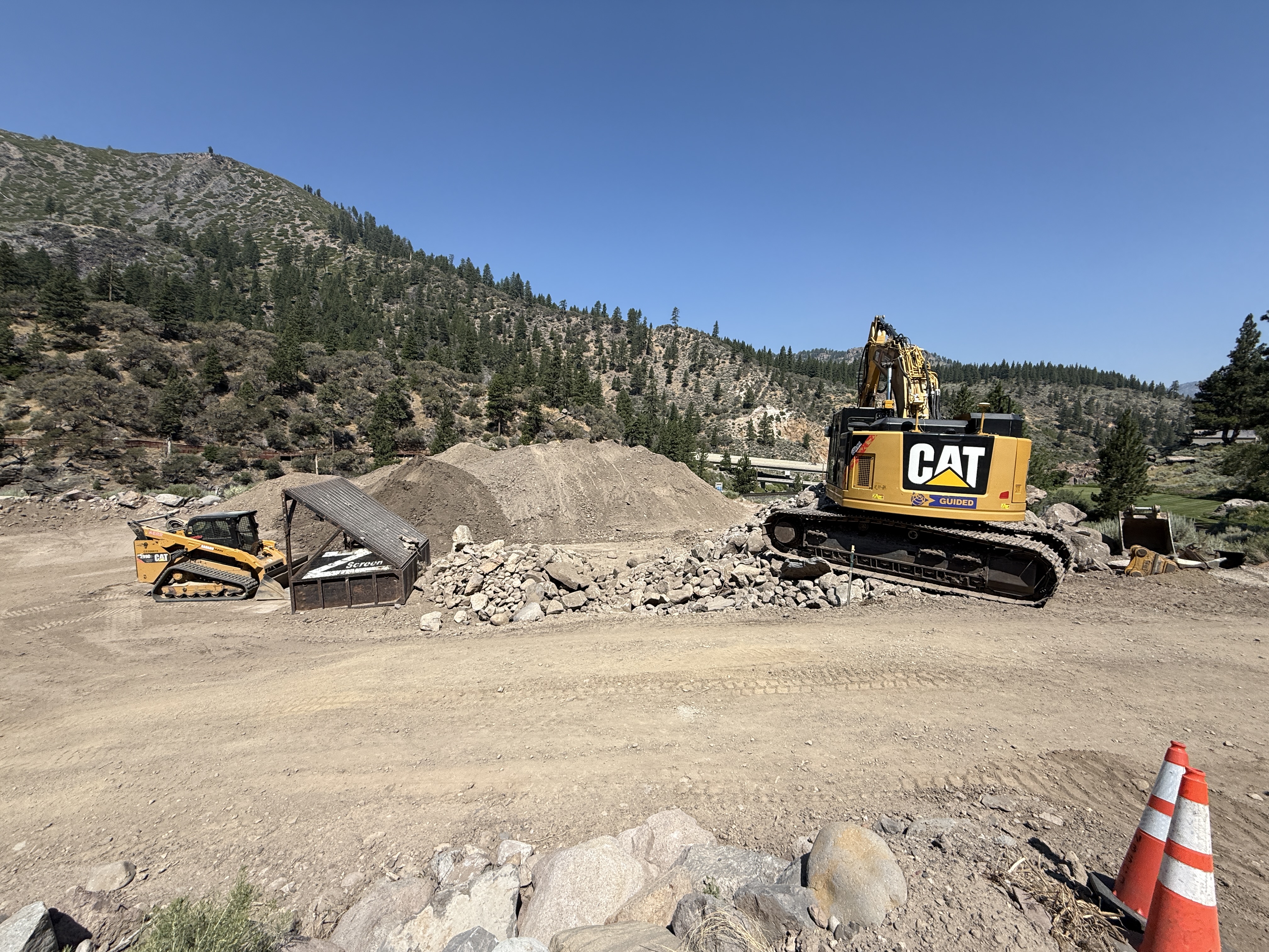 The image shows an excavation site with two Caterpillar machines. A large excavator is positioned on the right atop a mound of rocks, and a smaller tracked loader is on the left near a dirt pile. The background contains a wooded hillside, and traffic cones are visible in the foreground. The sky is clear with good daylight conditions.