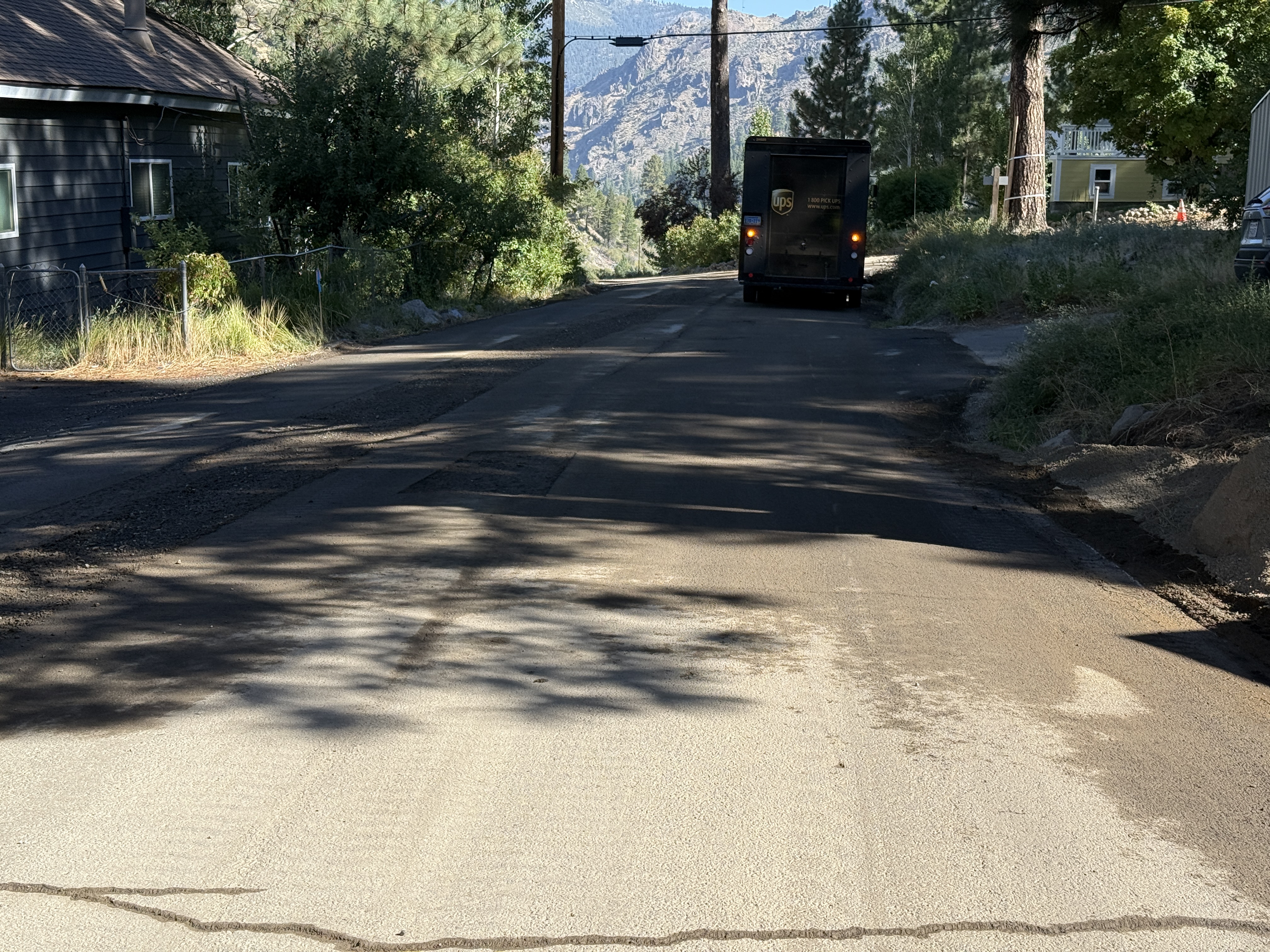 paved road with patchy repairs sunny with shadows open road access without congestion