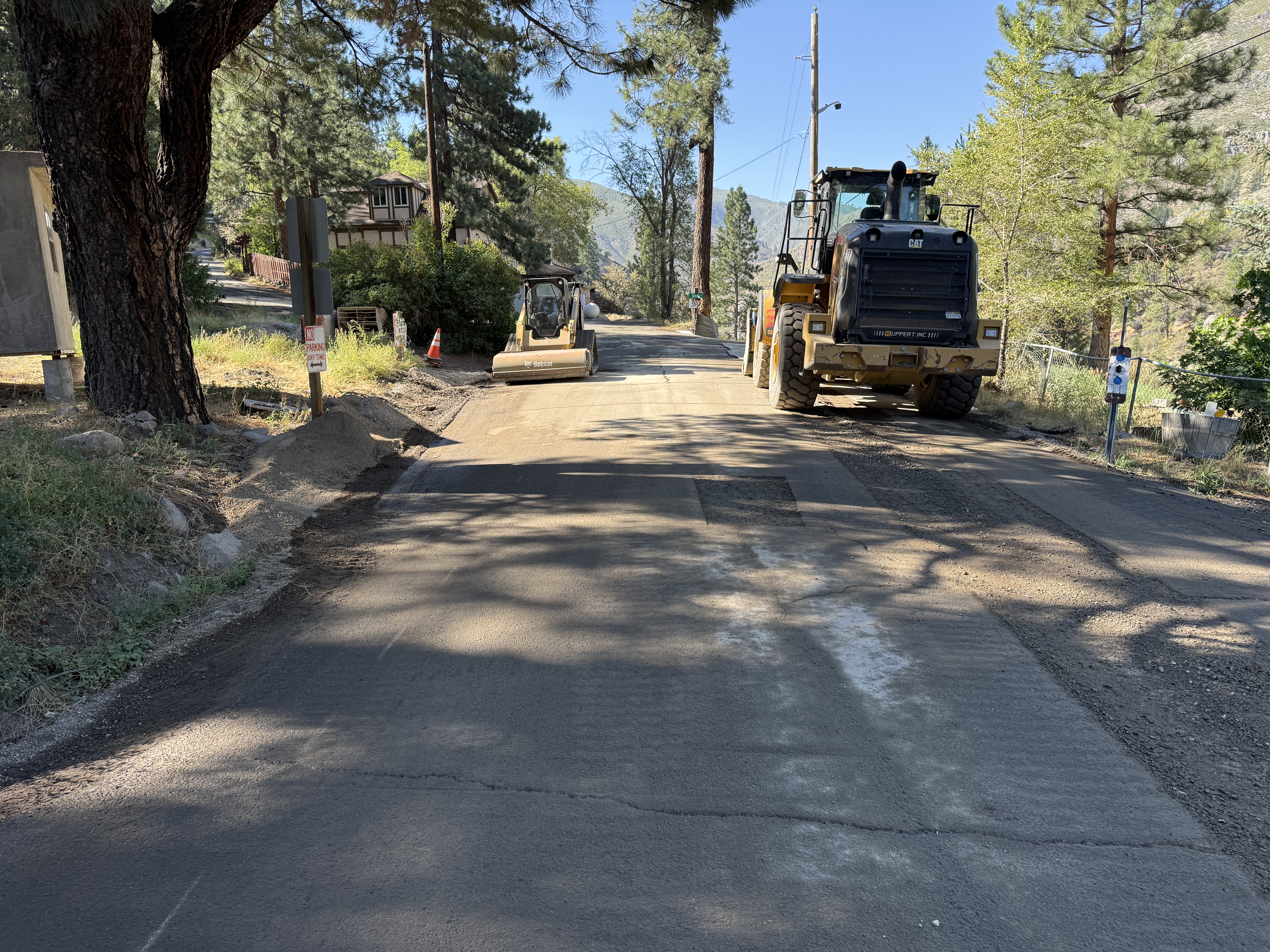 The image shows a roadwork scene with two pieces of heavy machinery, including a roller and a wheel loader, parked on an unpaved road. The road surface appears to be in the process of being prepared or finished, with fresh dirt and some uneven sections visible. Trees and residential structures line the sides of the road indicating a residential area. There are cones and a traffic sign visible indicating some form of traffic control.