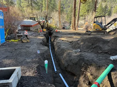 A significant amount of loose soil is piled on the right side of a paved road, with some soil spread onto the roadway itself. To the right, there is a residential area with maintained landscaping. The soil appears to be uncontained and may indicate preparation or cleanup work. There is no visible construction equipment or indicators of ongoing activity.