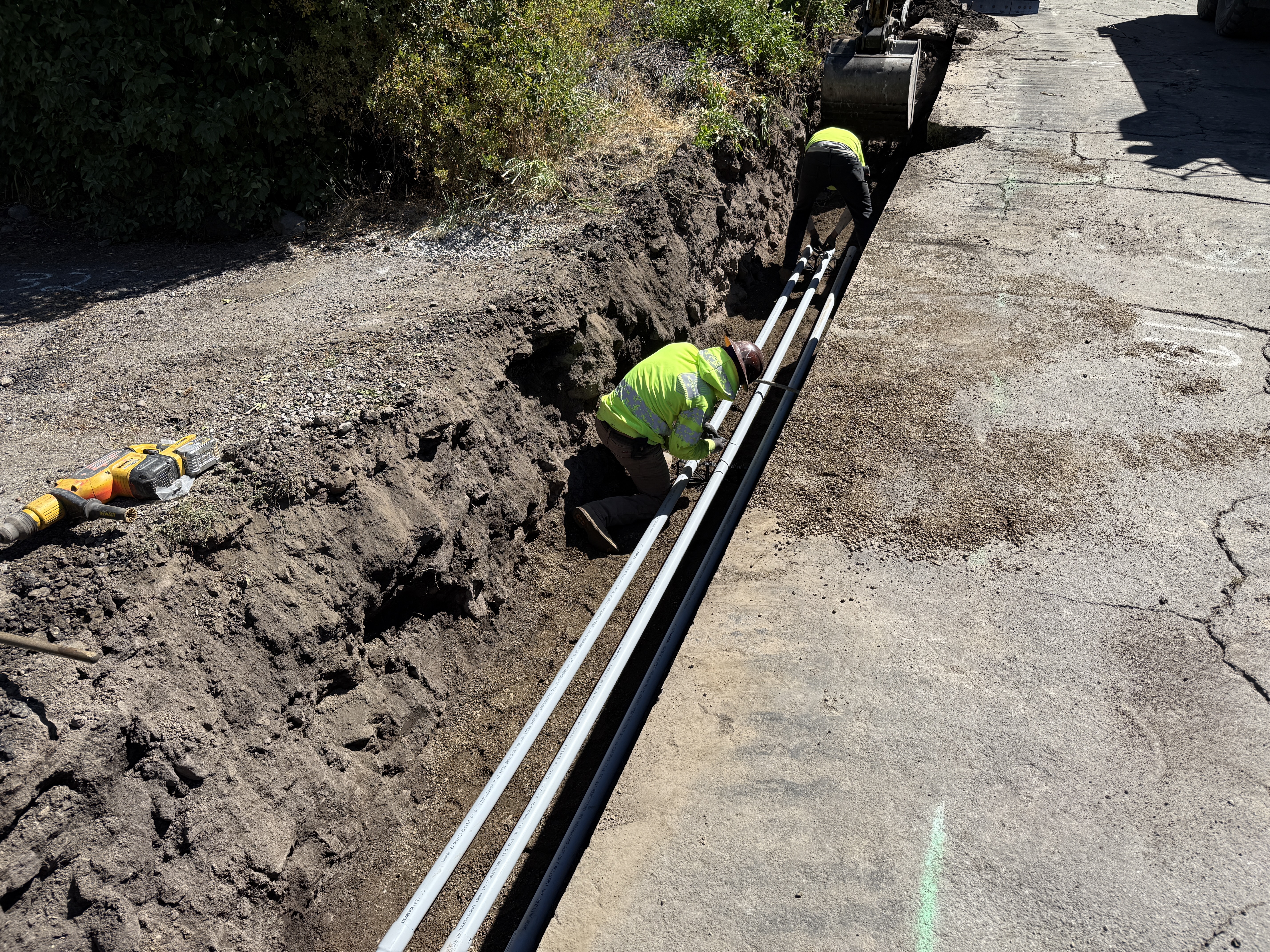 Two workers are inside an open trench, installing conduits. They are positioned on either edge of the trench, adjacent to each other. The trench is unpaved and runs alongside a paved surface. An excavator bucket is visible at the end of the trench, suggesting excavation activity occurred. A power drill is resting on the ground next to the trench.