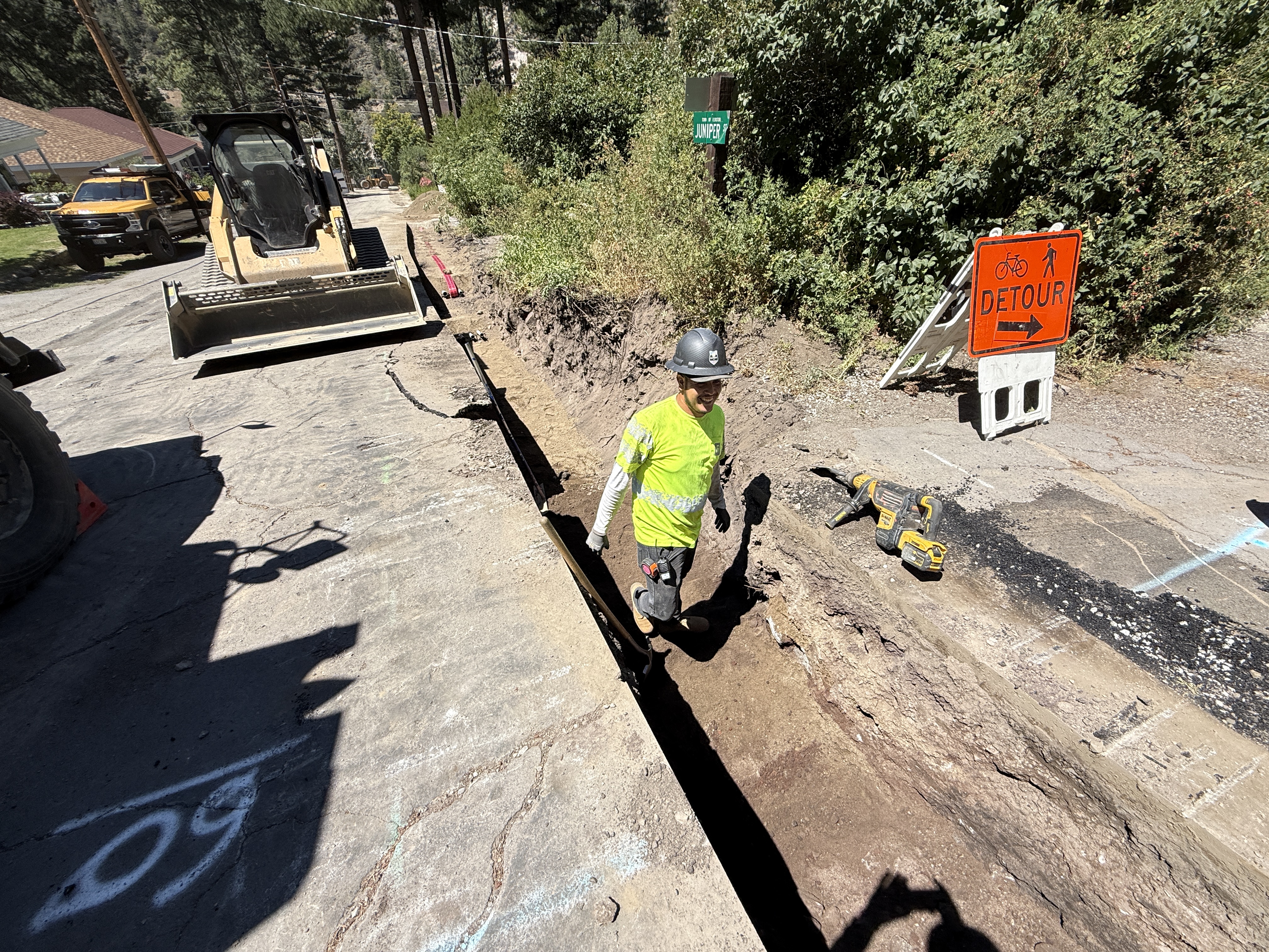 A worker is seen standing inside a trench that is cut into the pavement. A skid-steer loader is positioned on the road near the trench. There is a power drill placed near the trench edge. An orange detour sign is visible, indicating an alternative route for pedestrians and cyclists.