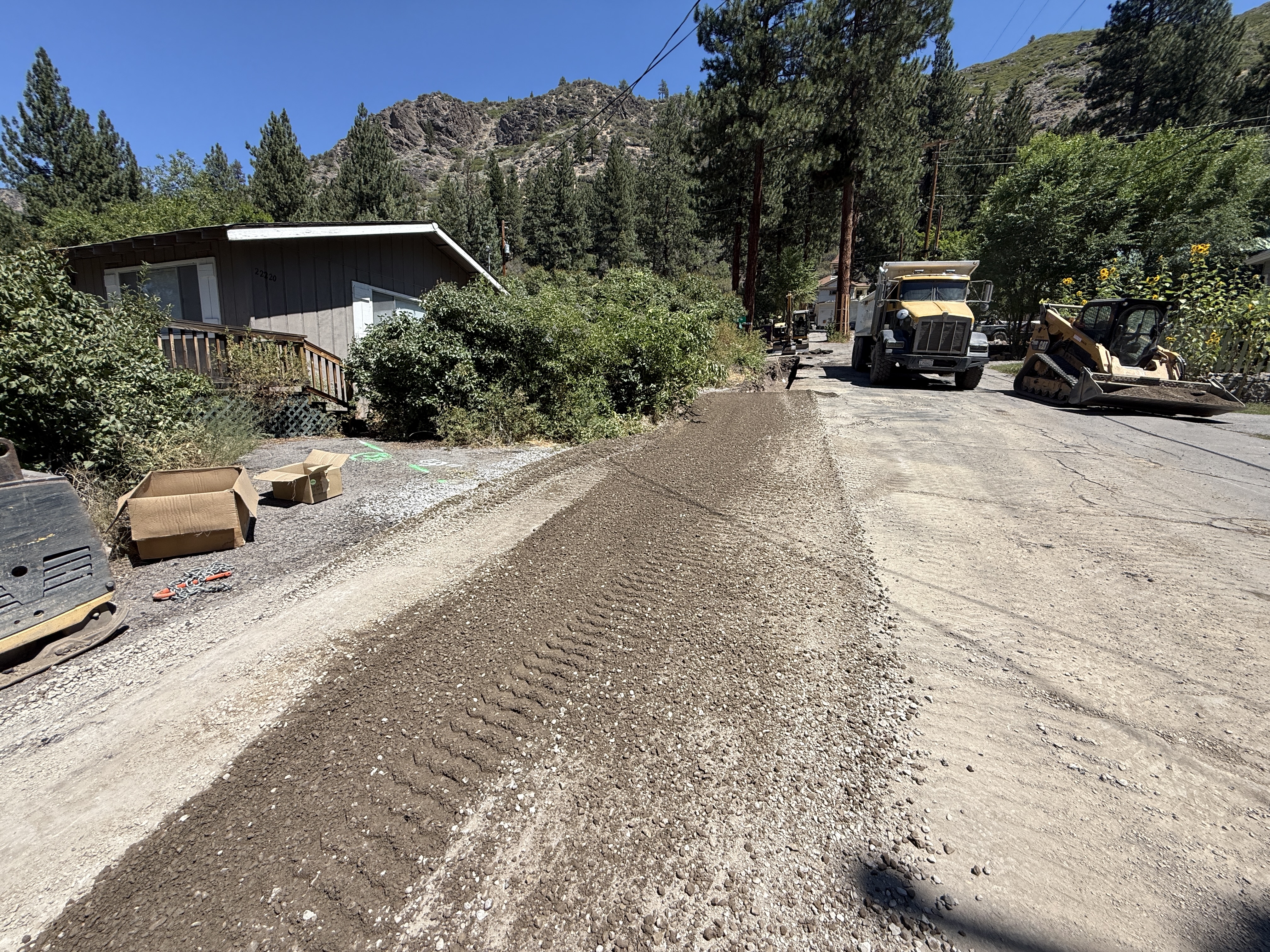 The image shows paving or surface restoration in progress with a dump truck parked on the road and a skid-steer loader present. Loose aggregate is spread across part of the road, marked by tire tracks indicating recent grading. A nearby structure is visible with overgrown vegetation beside it, and the work area appears clear of other materials or workers.