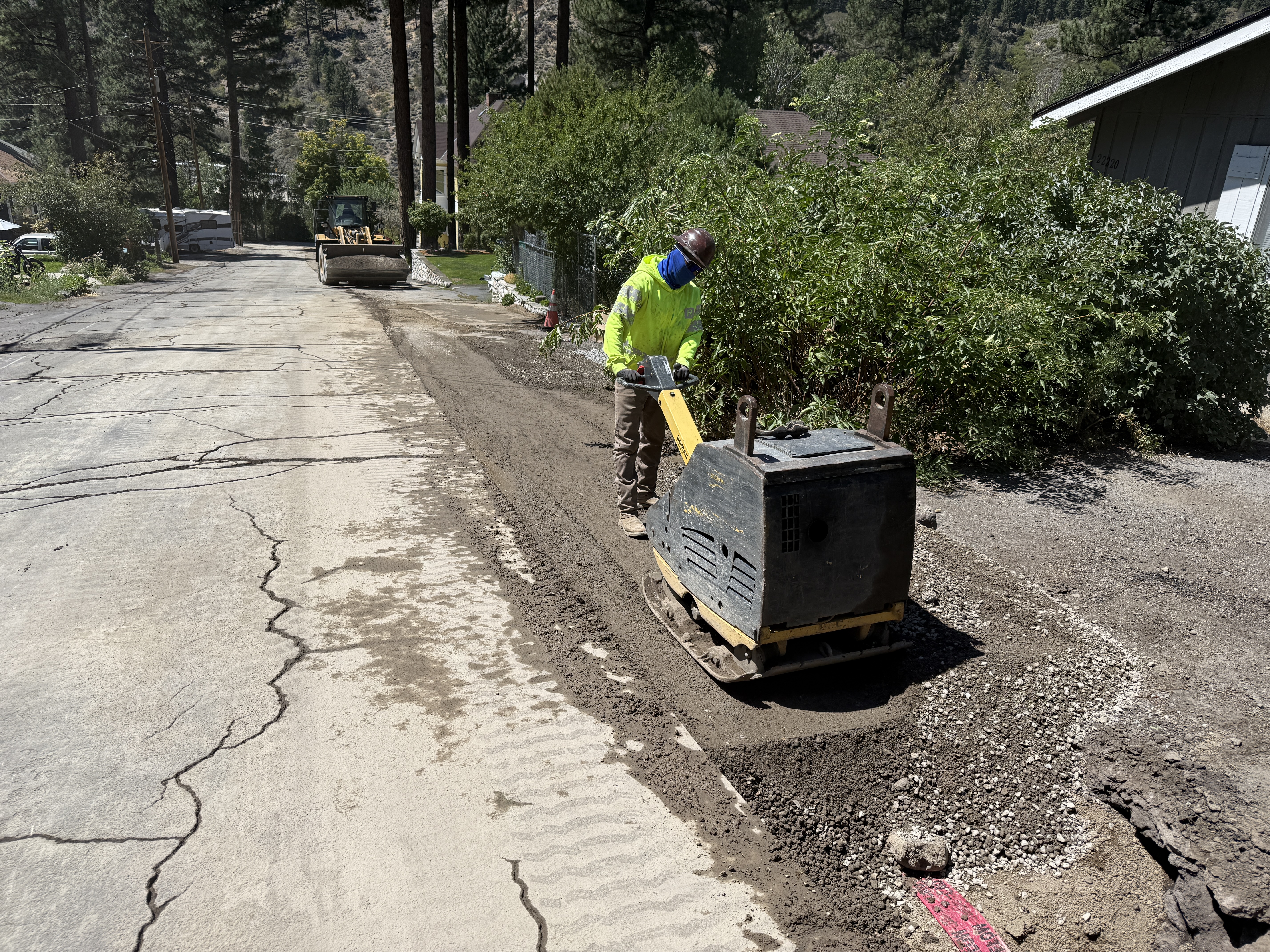 The image shows a construction worker operating a vibratory plate compactor on a gravel surface adjacent to a cracked asphalt road. A worker in hi-vis safety gear is compacting the ground along what appears to be a trench or edge of the road. The surroundings include trees, shrubs, and residential buildings.