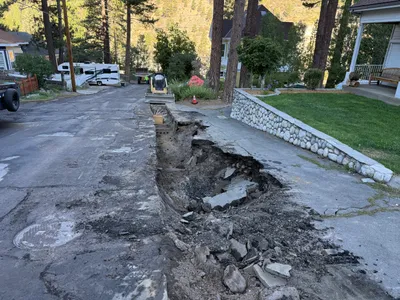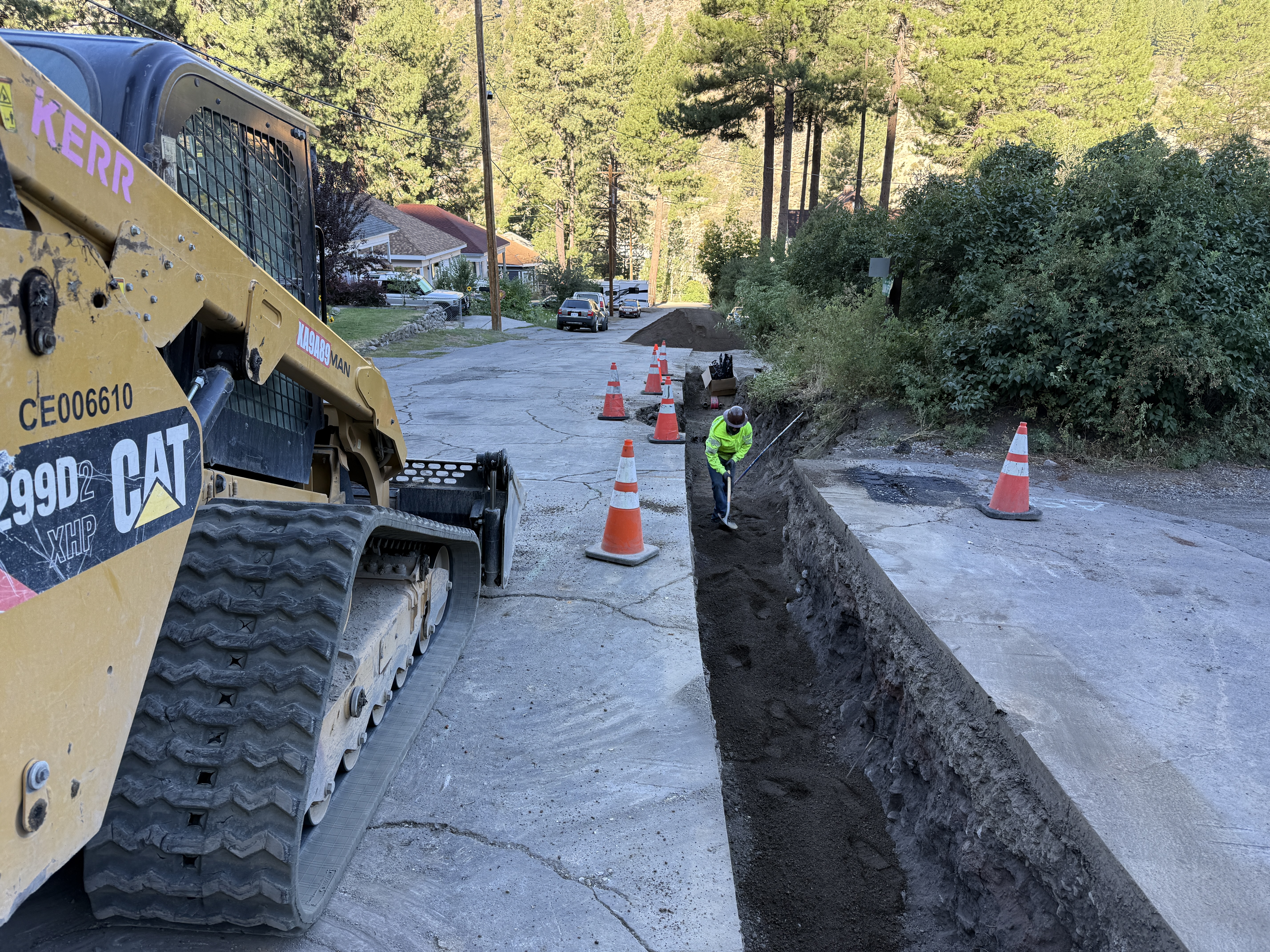 The image shows a worker manually leveling or digging soil in an open trench while wearing safety gear. A skid-steer loader is parked nearby, and several traffic cones are placed along the trench line, likely to direct or warn nearby traffic. The trench runs parallel to an existing roadway. The surroundings include forested areas and residential buildings, indicating a suburban construction setting.