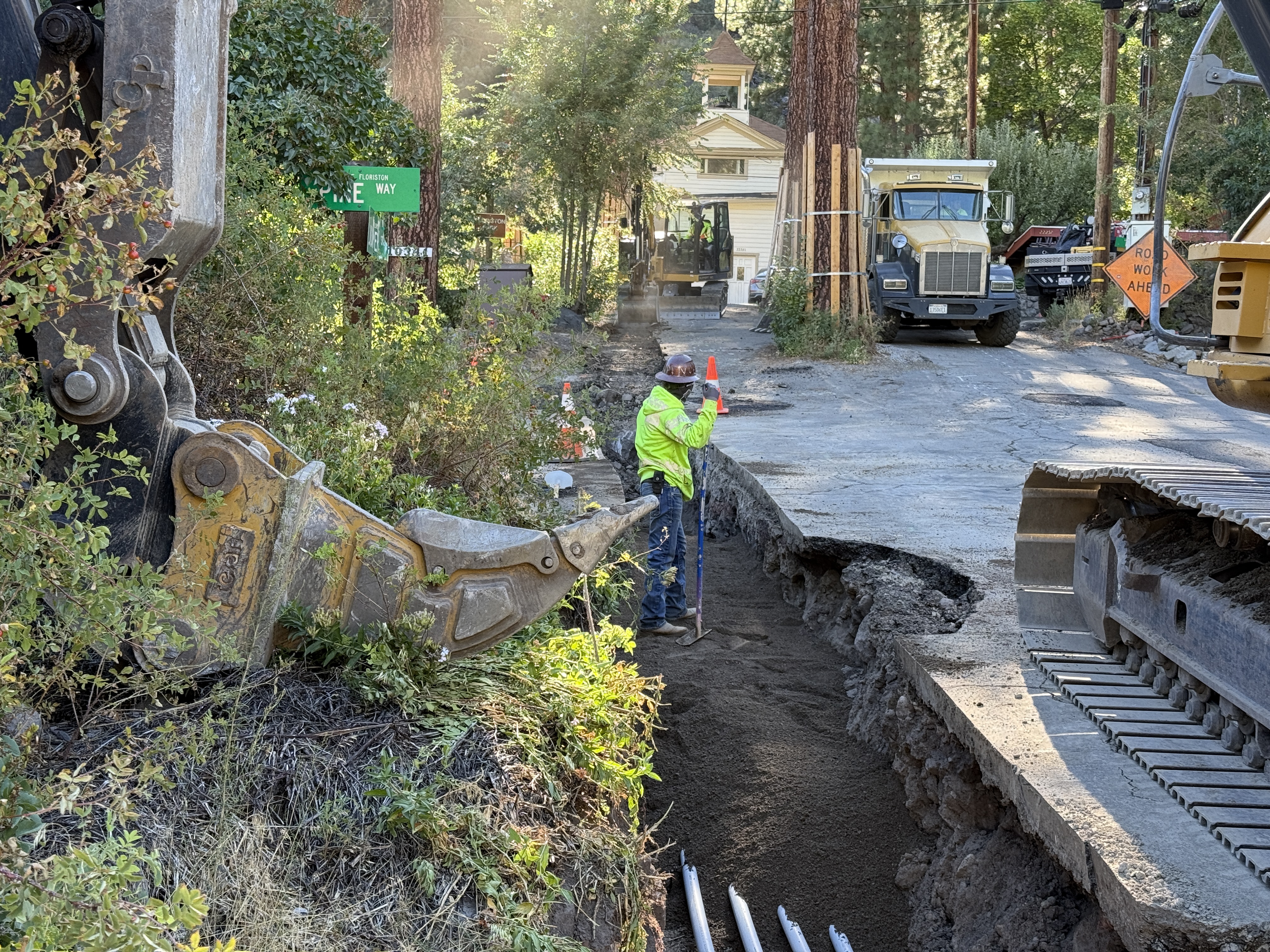 The image shows a construction worker standing in a trench surrounded by excavators. The worker is using a tool, possibly a shovel, to manage soil in the trench where conduit pipes are visible. There are multiple trucks and pieces of heavy equipment on the paved road next to the trench, with a street sign visible nearby.