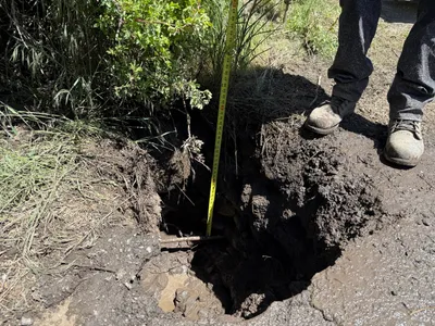 paved road with open trench sunny with clear lighting roadside access with some congestion