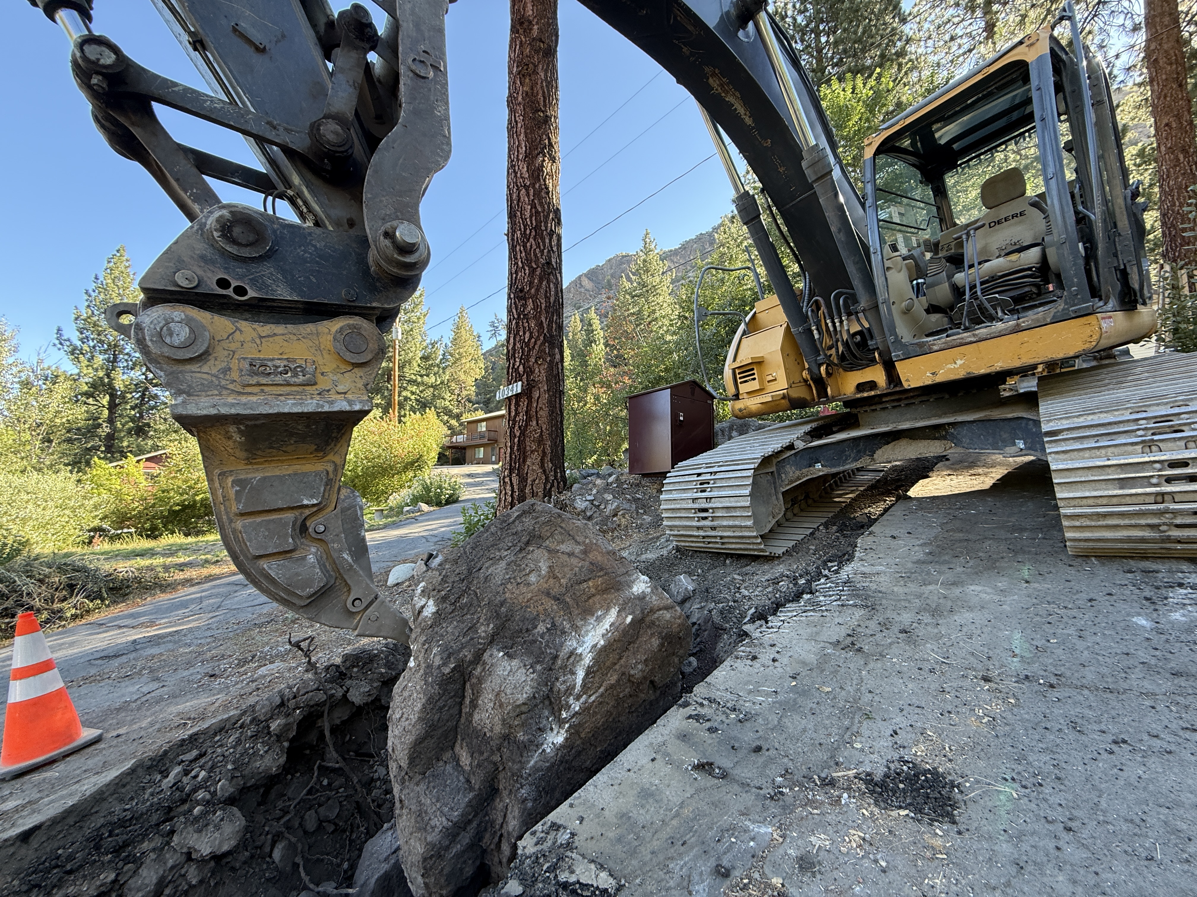 The image shows an excavator removing a large rock from a trench on a dirt or paved surface. The excavator is positioned on a cleared area with its arm extending into the trench. A safety cone is placed nearby on the left side, suggesting caution around the excavation site. The environment is wooded, indicating the project location is outdoors and among trees.