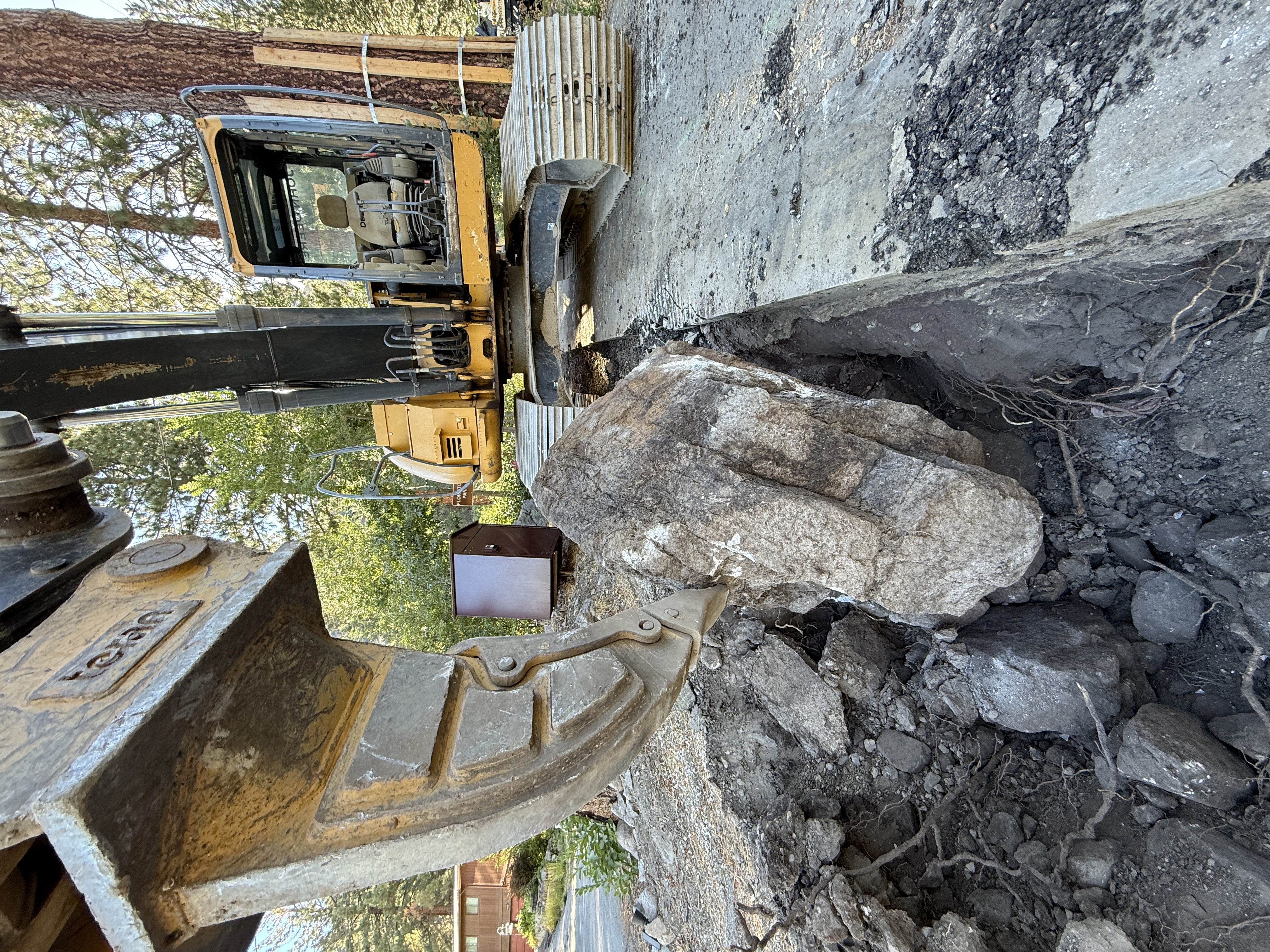 The image shows an excavator with a bucket attachment lifting a large rock from the ground. Soil and smaller rocks are visible around the excavation area. The excavator is positioned on a stable surface, possibly concrete or compacted soil. The background includes trees and part of a structure.