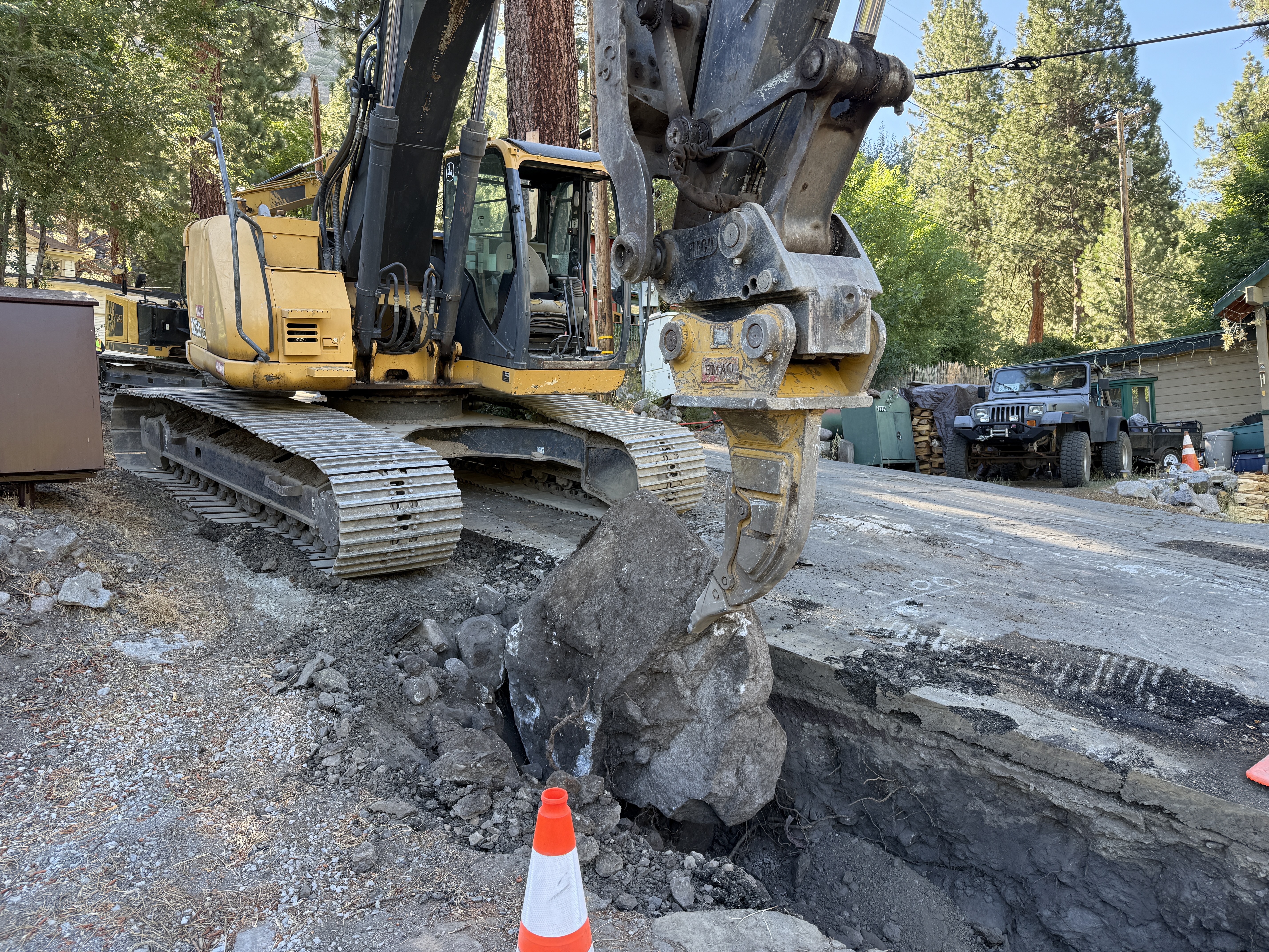 The image shows a hydraulic excavator removing a large rock from a trench. The trench is located on a paved street surrounded by trees. An off-road vehicle is parked nearby, and there are orange cones for marking. It appears excavation work is ongoing, but the specific phase or purpose is unclear.