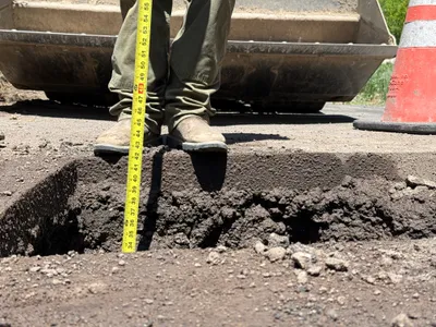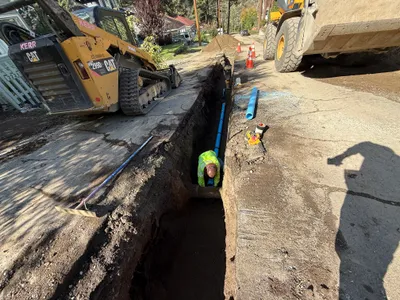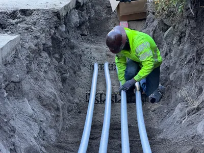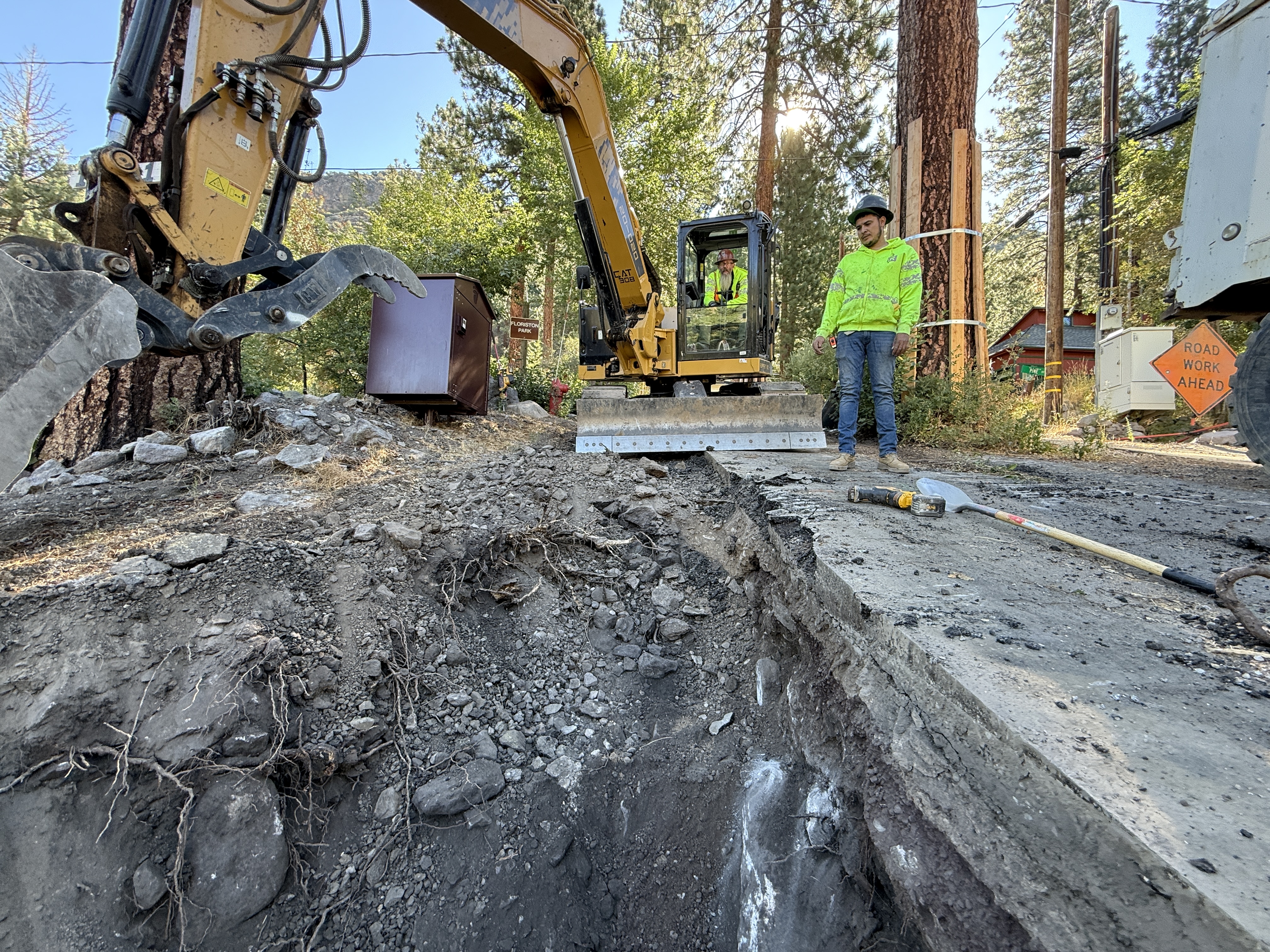 The image shows a trench being worked on, with an excavator positioned next to it. A construction worker is standing beside the trench wearing a hard hat and hi-vis vest. Another worker is inside the excavator. The trench appears to be on uneven rocky ground with visible tree roots. The background shows trees and a construction sign indicating road work ahead.
