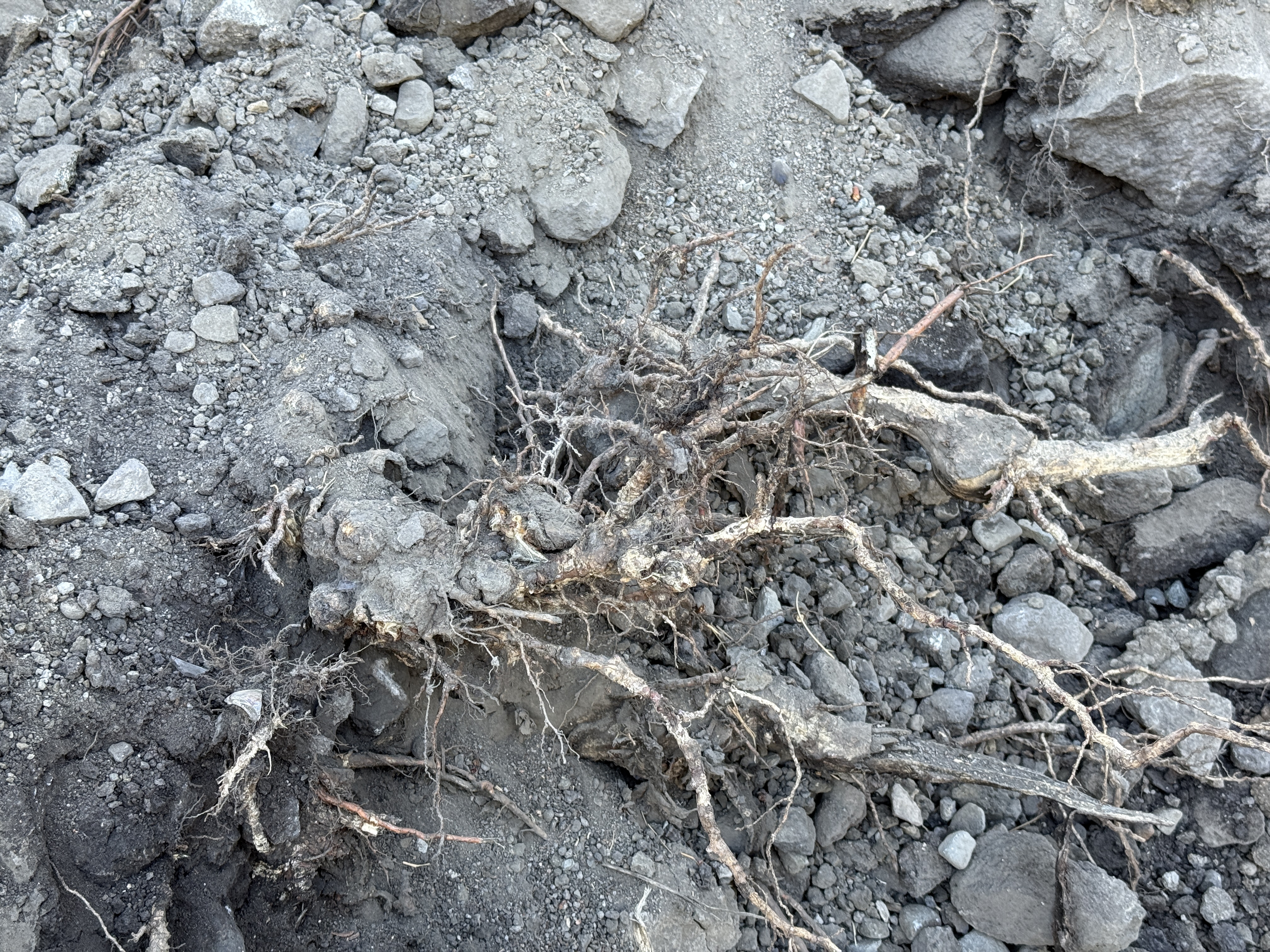 The image shows exposed tree roots amidst a rocky soil surface. The soil appears loose with various sizes of rocks and cobbles. There is no visible construction activity taking place at the moment. The setting seems to be a site area where excavation or groundwork has recently occurred.