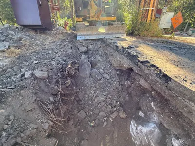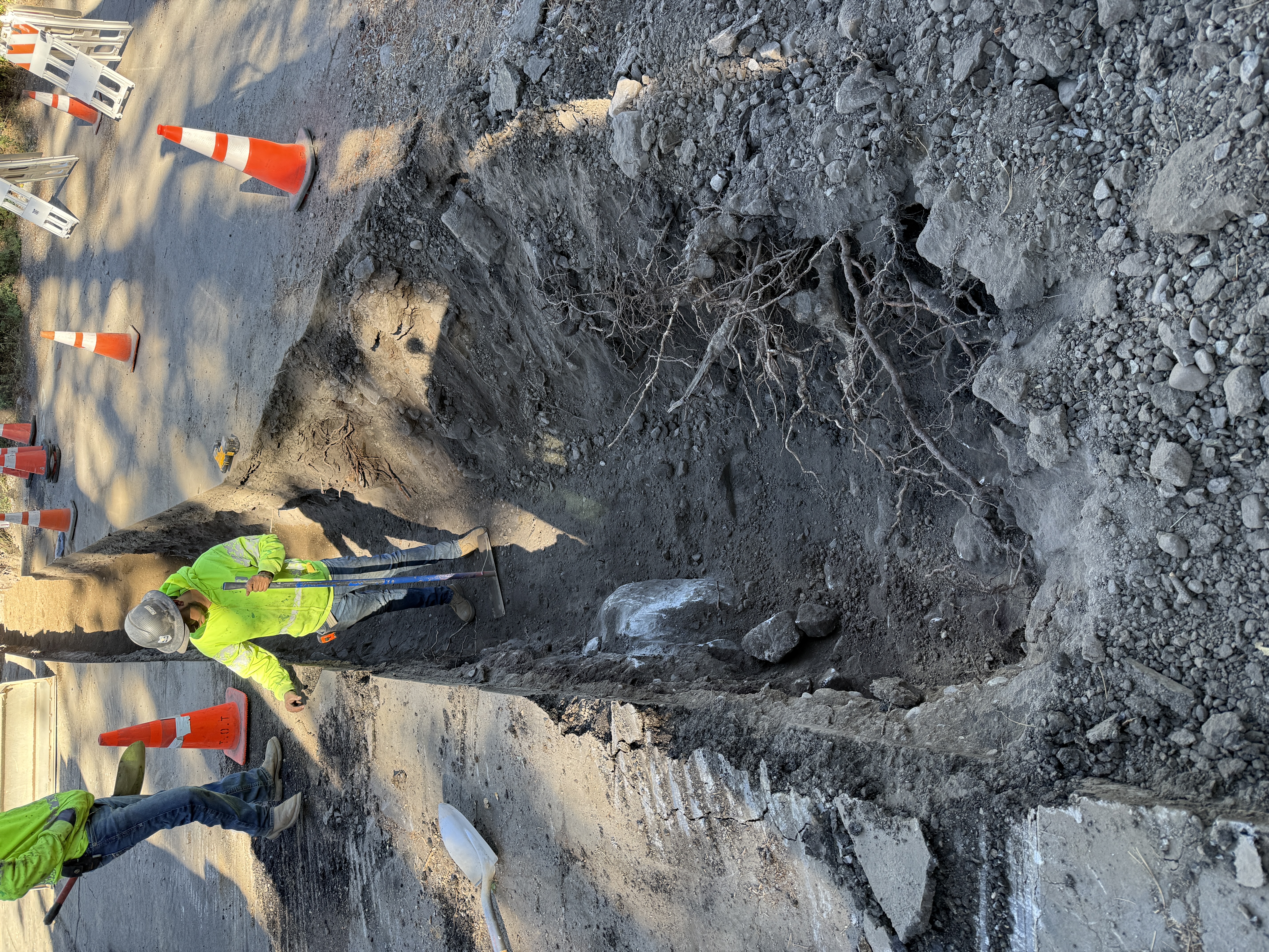 dirt with visible roots and trench clear daylight surrounded by cones indicating restricted access
