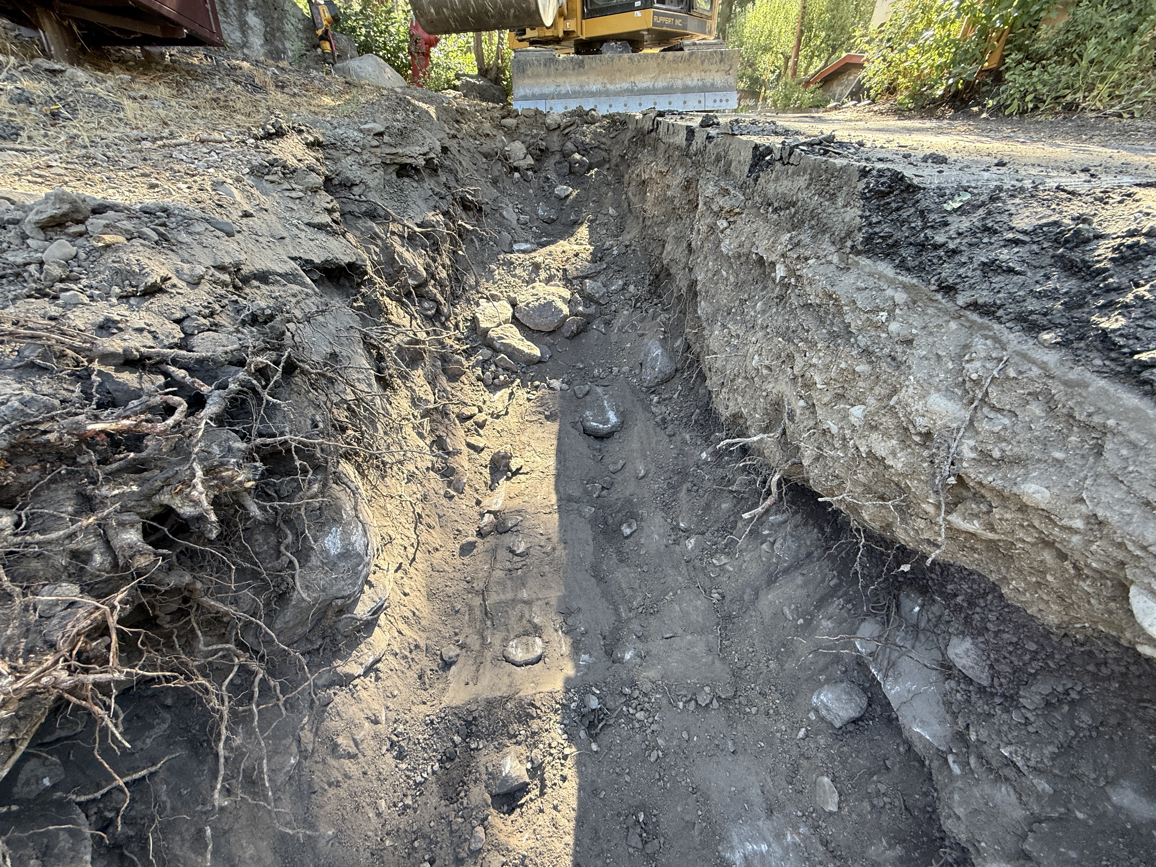 An open trench is visible running along the ground, with exposed soil and some rocks. A piece of heavy equipment, possibly an excavator, is seen at the end of the trench, suggesting earthwork activity. The trench appears to have roots and varying soil layers visible, indicating recent digging. There are no visible pipes, conduit, or other infrastructure components inside the trench.