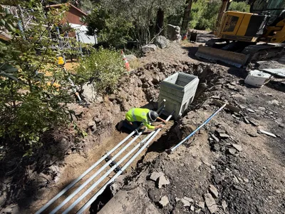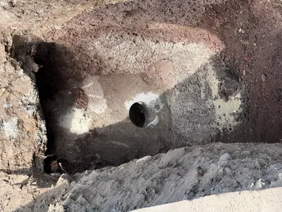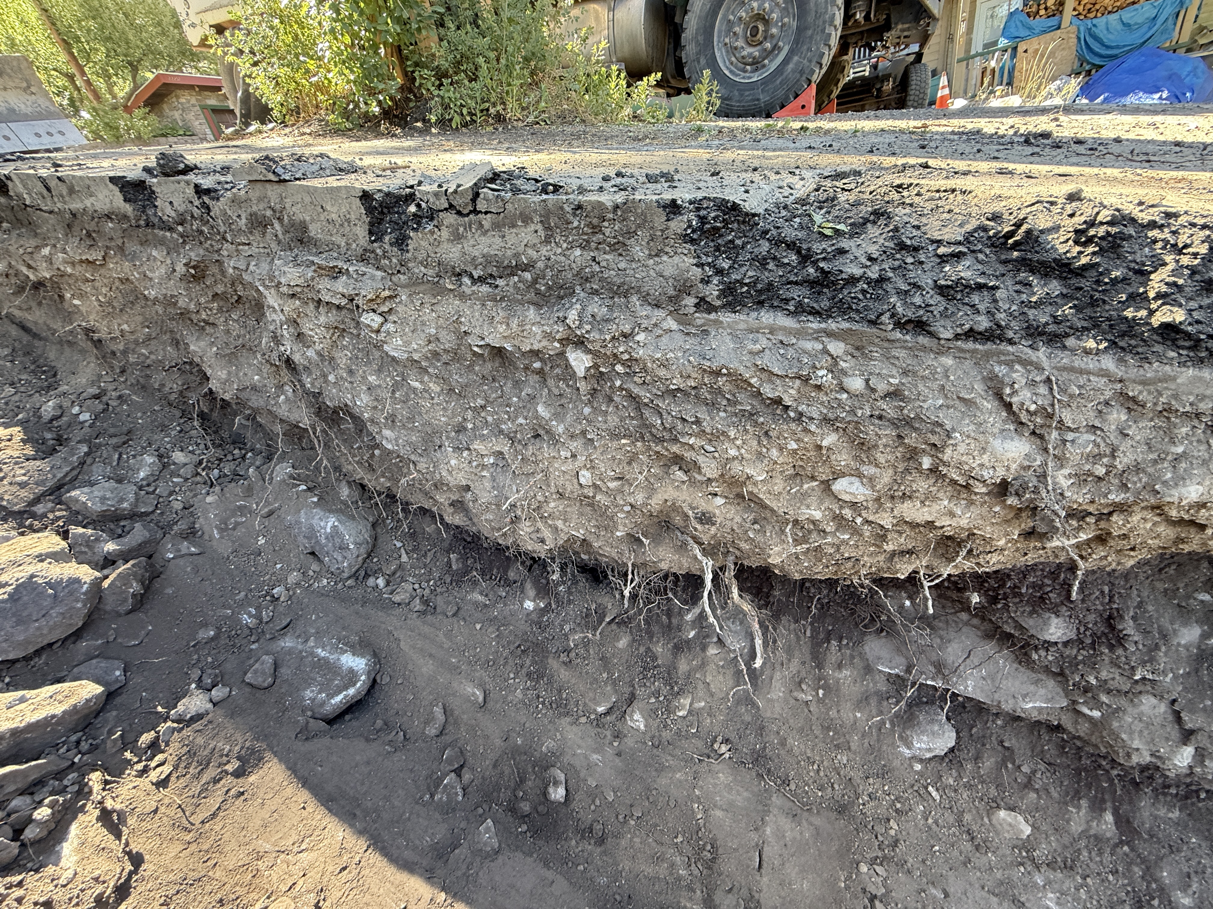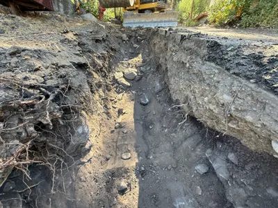 The image captures a trench section with distinct soil layers and an upper asphalt layer. Vegetation and large rocks are visible alongside the trench, suggesting recent excavation work. A vehicle wheel is visible in the background, indicating nearby construction activity. The trench depth exposes different soil compositions, and roots are hanging from the disturbed earth.
