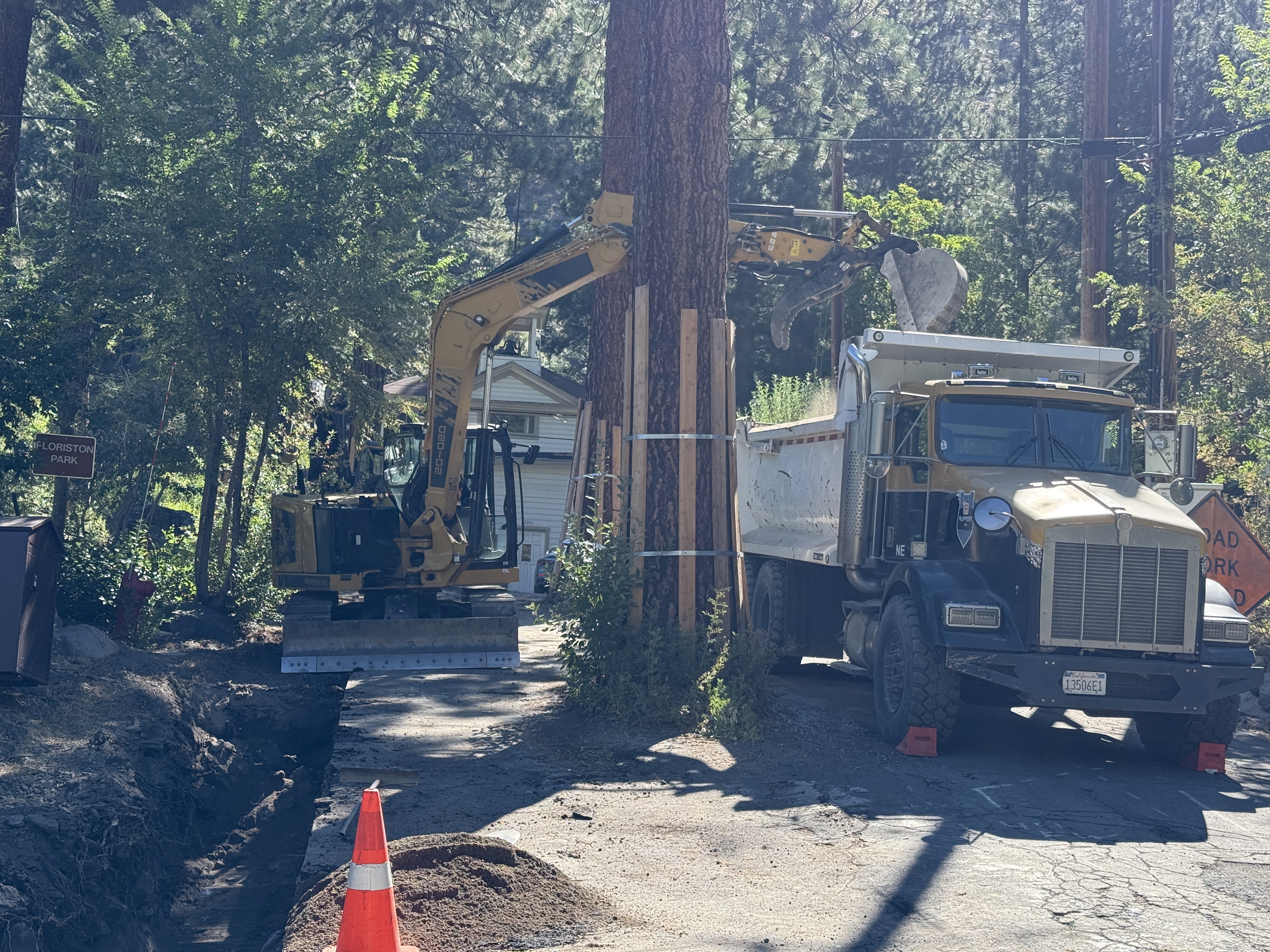 The image shows a trench on the left side of the path, extending from the foreground into the distance. An excavator is actively engaged in digging or clearing the trench. A large dump truck is parked adjacent to the excavator, likely to transport soil or materials. Safety cones are placed at the beginning of the trench to indicate ongoing work.