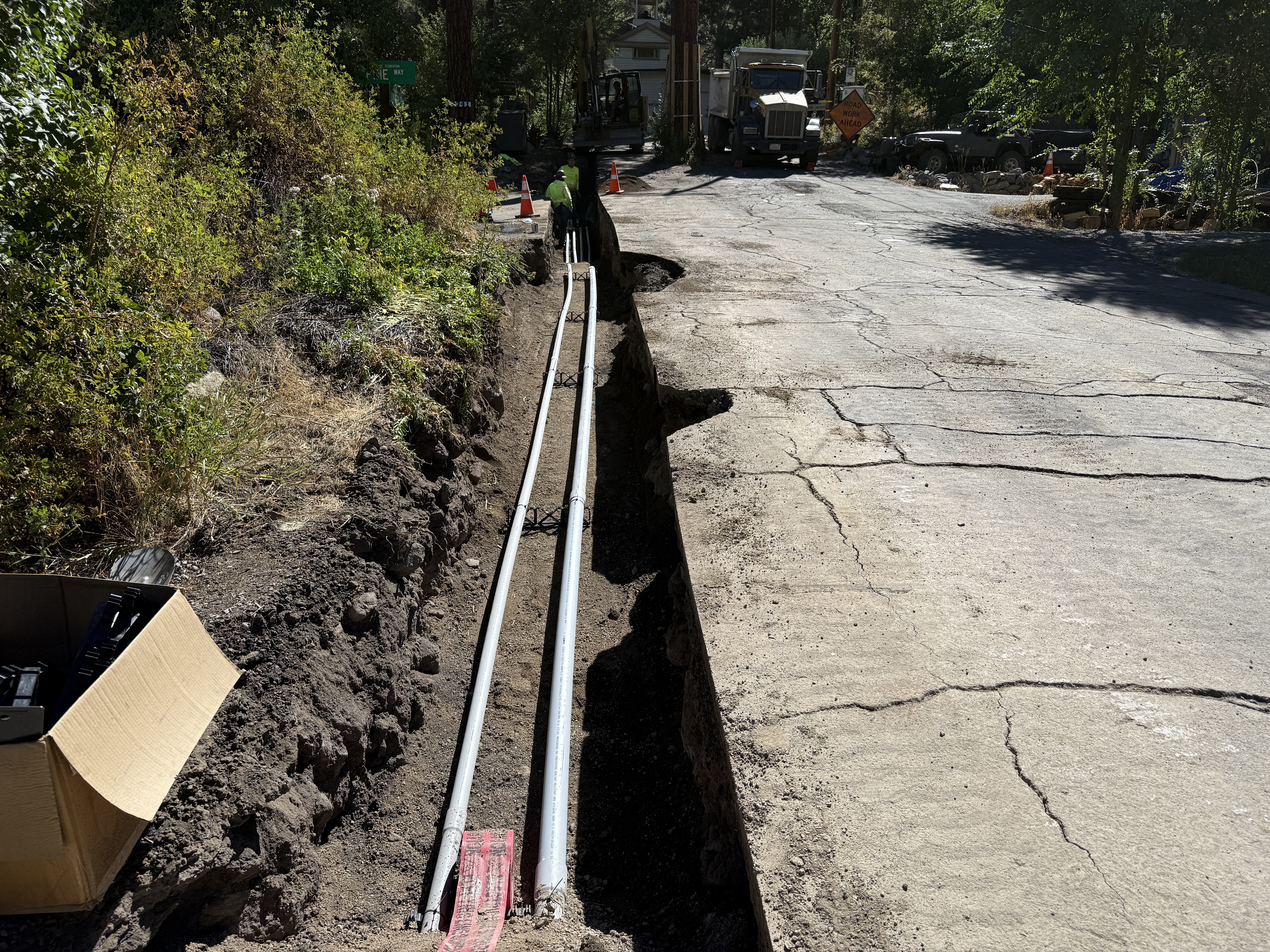 The image shows a long open trench along the side of a road, with two conduits installed within and supported by metallic brackets. An individual is working near the trench, and there are warning cones positioned along the road. A construction vehicle is visible in the background.