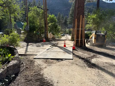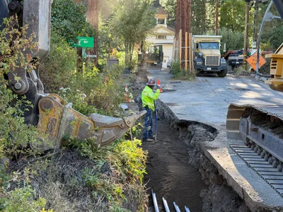 Safety features like warning tape and cones are visibly in place around the trench.