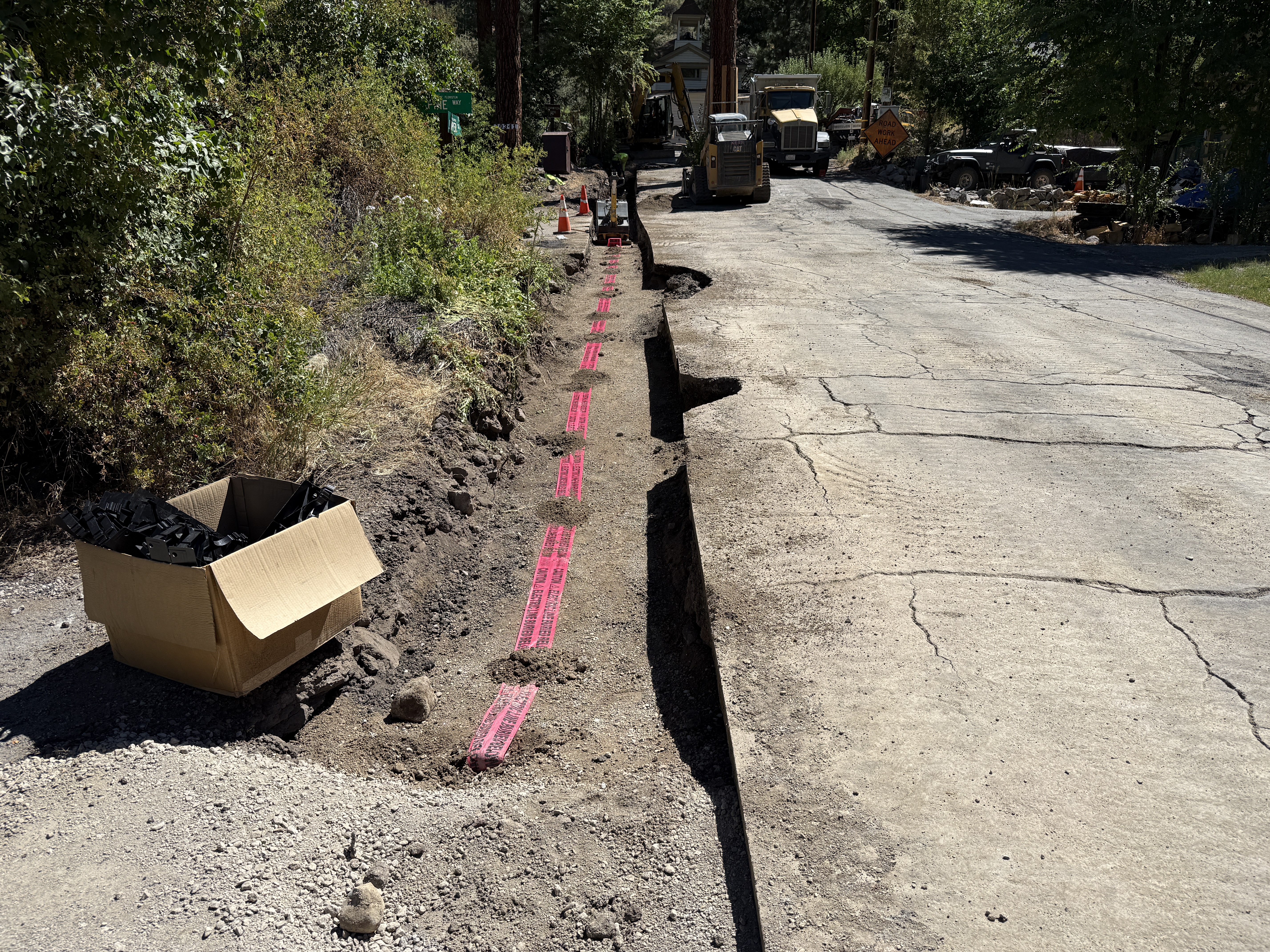 A trench is dug alongside a road, with red warning tape laid along its length. A large pothole or cavity is observed in the trench. A piece of heavy equipment and a truck are at the far end of the trench. There are cones and a caution sign indicating work ahead.