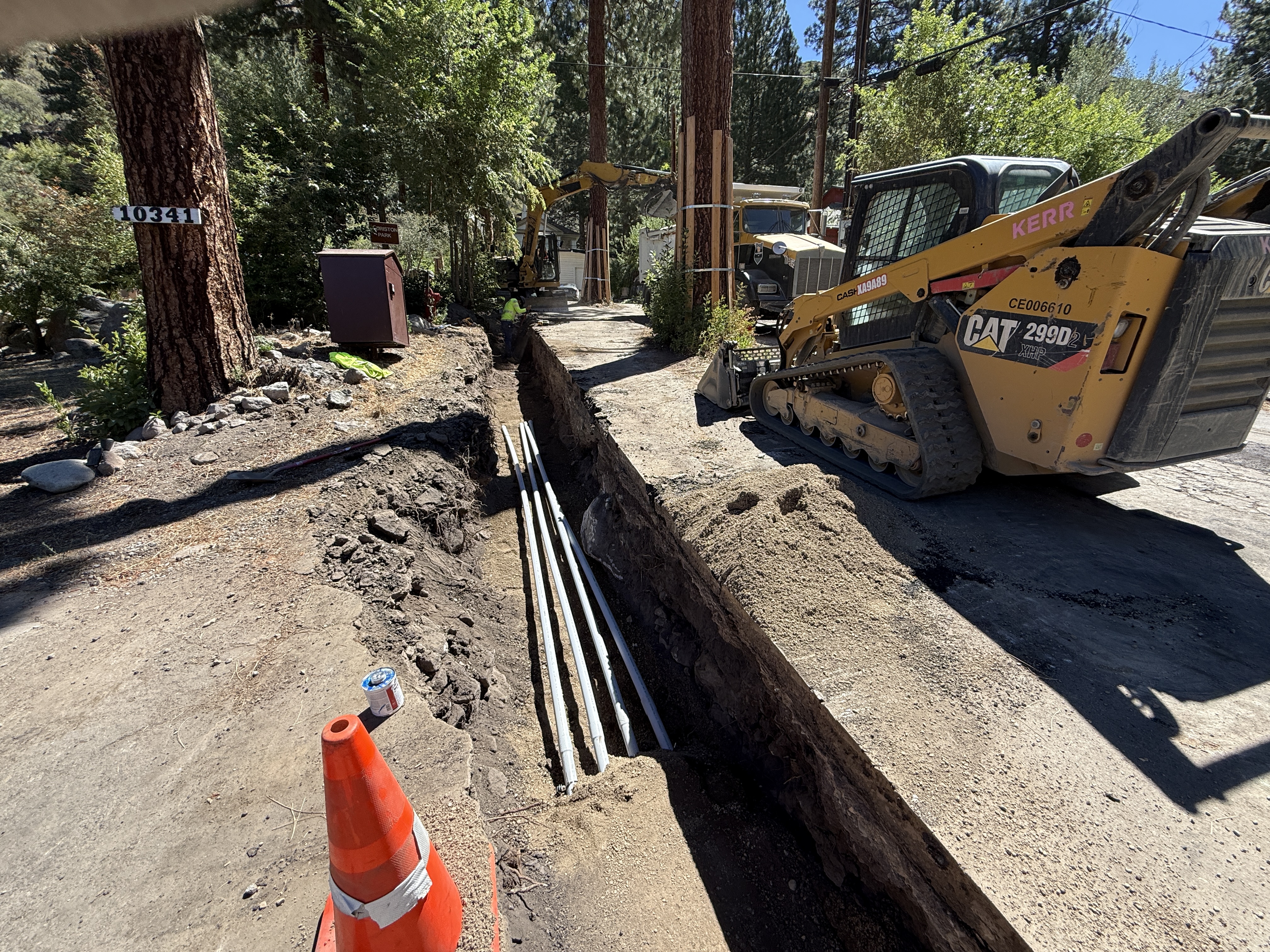 The image shows an open trench running parallel to a tree-lined roadside, with several conduit pipes laid within it. A tracked loader is parked adjacent to the trench, and a construction worker is seen further down the trench. There is a large orange cone marking the trench entrance, and a number is visible on a tree trunk. Earth is piled up next to the trench, indicating recent excavation work.