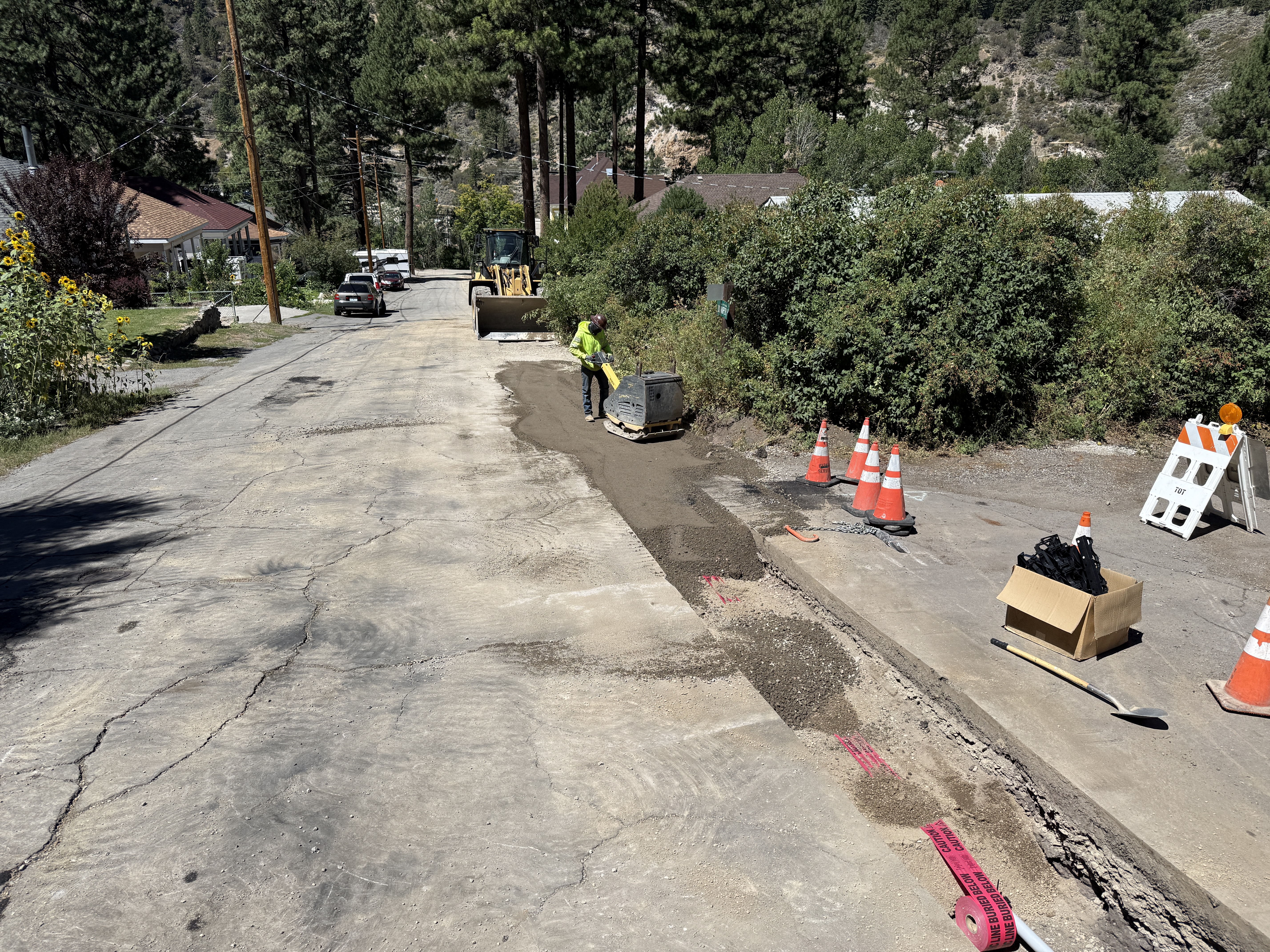 The image shows a residential street where surface restoration appears to be taking place. A worker in high-visibility clothing is using equipment on a section of the road where gravel has been laid out. Orange safety cones and a road closure sign indicate traffic control measures. Nearby, a backhoe is positioned on the street. Residential houses and vegetation line the street.