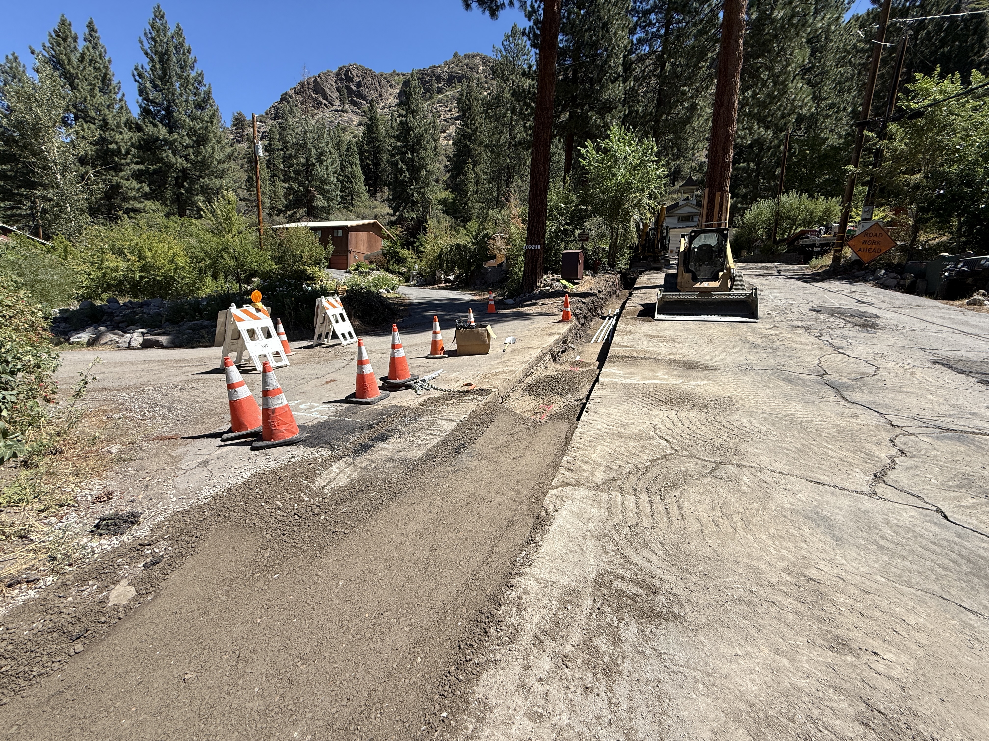 The image shows a trench along a roadside with multiple traffic cones and barriers indicating ongoing work. An excavator is positioned on the pavement, and the surrounding area includes trees and brush. The trench appears to have been recently initiated, with loose soil visible along the side. A construction sign in the background suggests roadwork ahead.